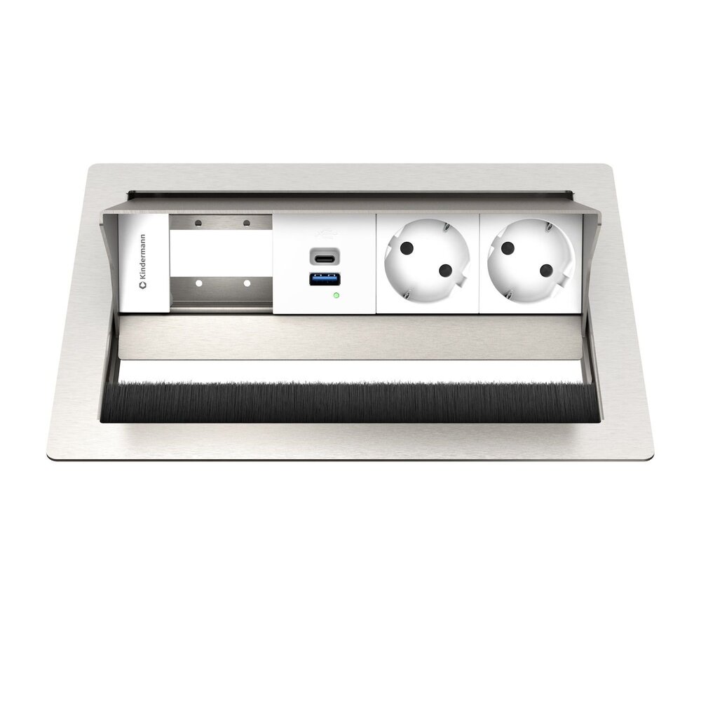 Zoals gezegd, je hebt de volledige keuze vrijheid voor het invullen van de open ruimtes in de tafel inbouwunit. Alle Kindermann Konnect Flex 45 modules zijn hiervoor geschikt. Voor elke video aansluiting, audio aansluiting en data-aansluiting is wel een module beschikbaar. Daarnaast zijn er ook extra laadstations, drukknop schakelaars en modules met een opening verkrijgbaar waarbij de kabel er dus direct uit kan komen. Kindermann gaat nog verder dan dat, want er zijn zelfs voor besturingssystemen als Needs zijn schakel panelen beschikbaar.