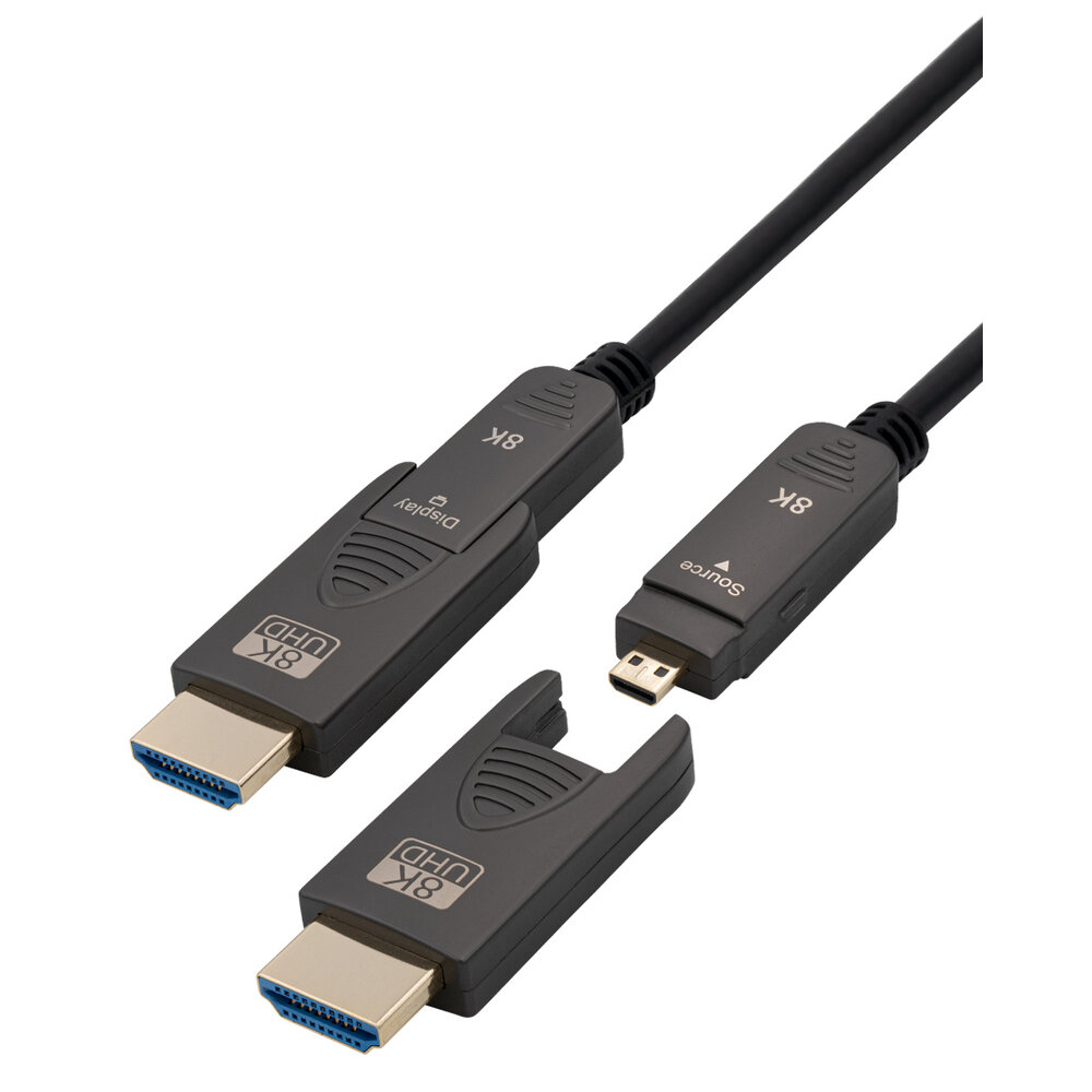Een Actieve optische HDMI kabel om het HDMI signaal over langere afstanden over te brengen. Aan beide zijde voorzien van een HDMI D+A connector en beide zijde waarbij er een aan te klikken HDMI A opzet stuk bij wordt geleverd. Dat maakt deze kabel ideaal om bijvoorbeeld met beleid door een 19 mm buis heen te trekken, vervolgens het HDMI A opzet stuk weer op de HDMI D connector te klikken en zo je apparatuur weer aan te sluiten, terwijl je de kabel via interne buizen kunt wegwerken.