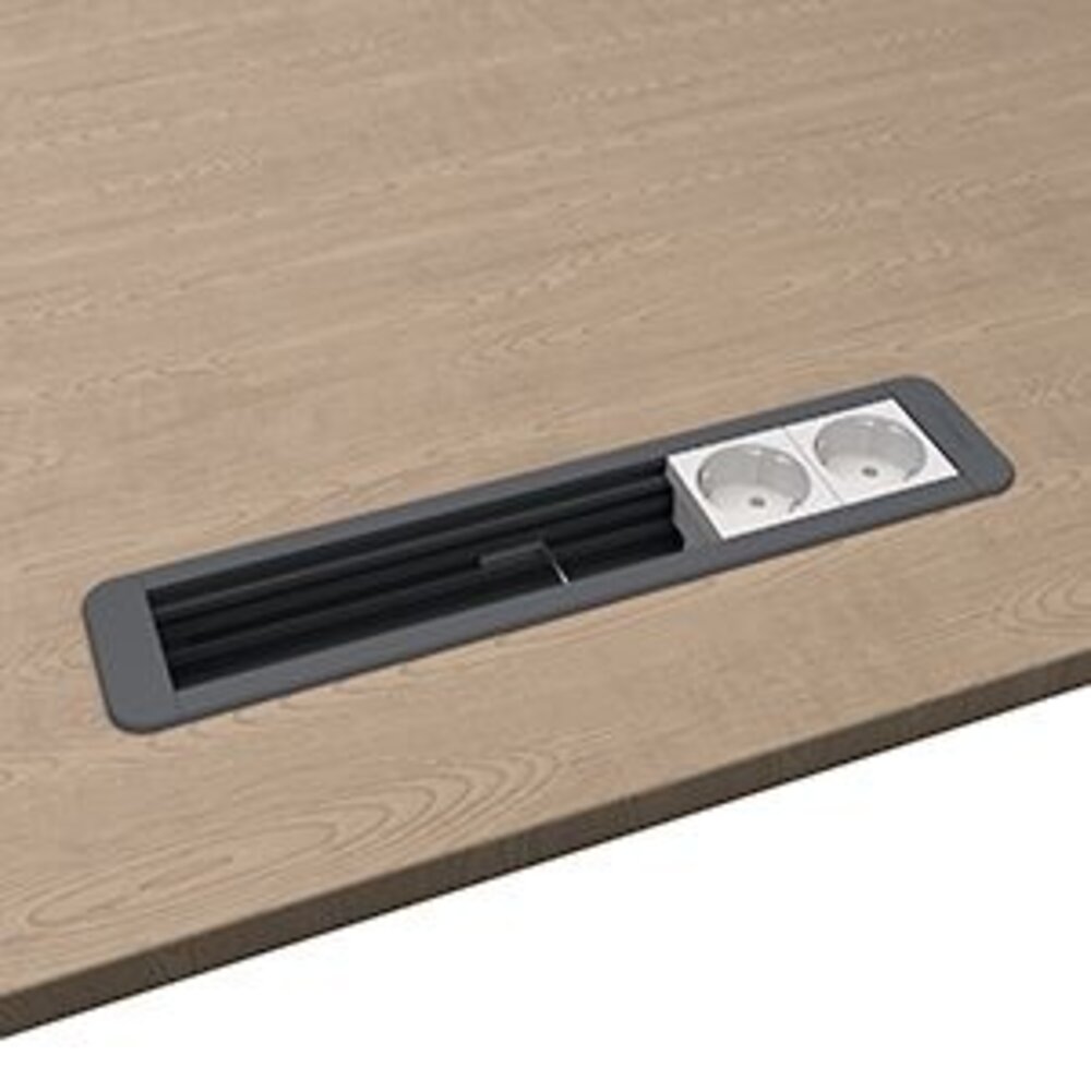 Alle stroom aansluitingen zijn met elkaar verbonden en worden via de voedingskabel dus gevoed, hetzelfde gelft voor een USB laadstation als de basis unit van de CablePort office is voorzien van een USB laadstation. De inbouwdiepte van deze unit is ca. 64 mm minus 0-40 mm (afhankelijk van het tafelblad). Hij is dus geschikt om in te bouwen in tafelbladen van minimaal 10 mm tot maximaal 50 mm. De randen zijn van een fraaie Leisteen grijze kleur (RAL7015) waar de binnenkan spierwit is (RAL9003) dat geeft een zeer chique uitstraling en een mooi geheel.