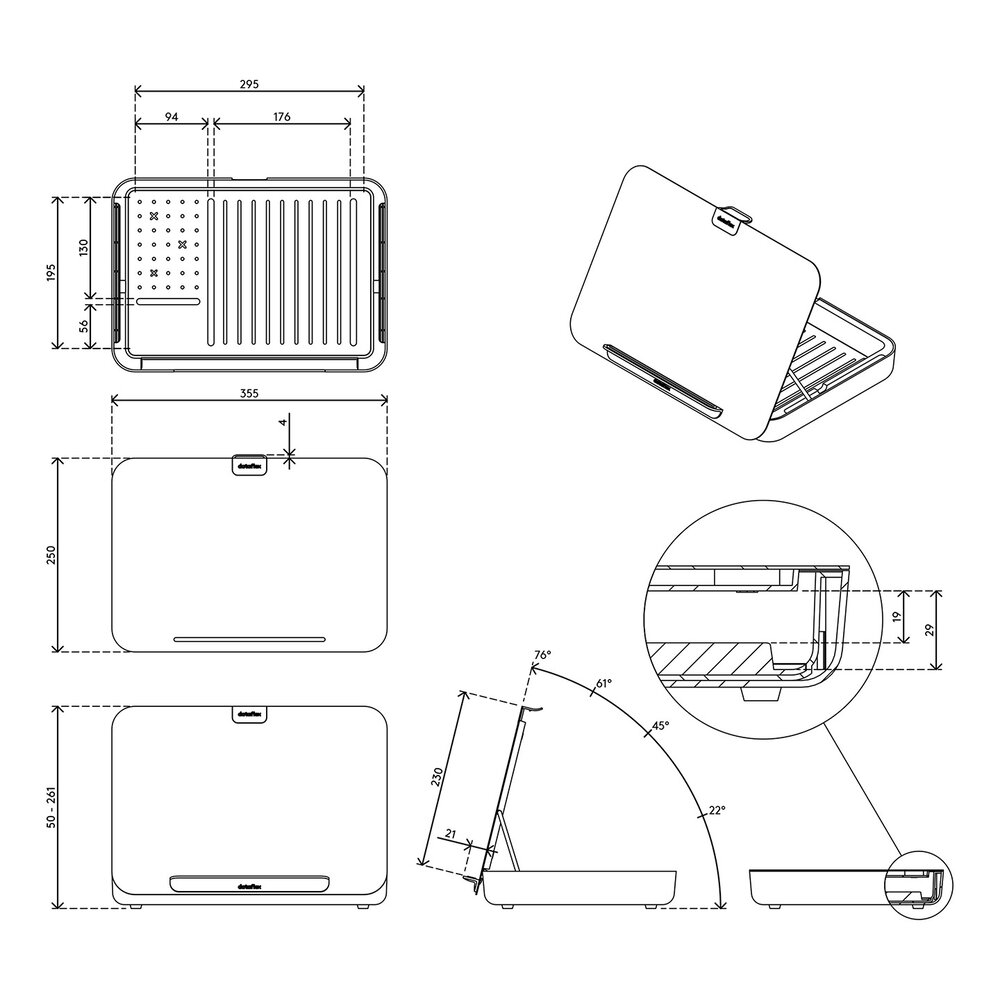 De binnenzijde van de Toolbox is van siliconen rubber, dit houd de inhoud veilig van beschadigingen. Er wordt een slim bedachte, magnetische "snap-on" steunrand meegeleverd die eventuele documenten, laptop of tablet op zijn plek zal houden. De steunrand is vanzelfsprekend ook weer in de toolbox op te bergen.. Je kunt de Toolbox belasten met maximaal 6 kg, ruim voldoende dus voor de meeste laptops en tablets. De totale afmetingen van de toolbox zijn 355 x 250 x 50 - 240 mm en hij is leverbaar in het wit of zwart. Op alle Dataflex Bento producten zit 5 jaar garantie.