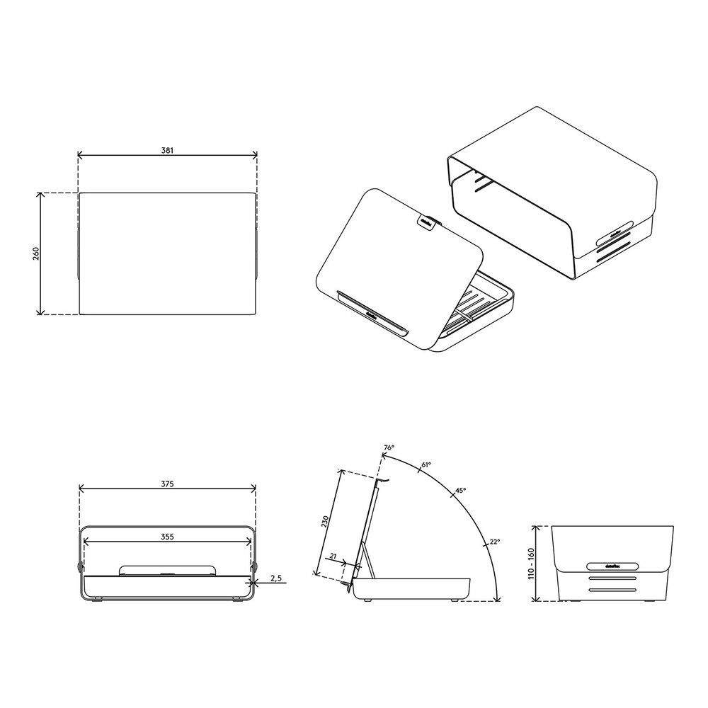 Een vormgeving waar over is nagedacht, geïnspireerd op de Japanse Lunchtrommel en een ontwerp van Robert Bronwasser. Je kunt in de box al je bureau accessoires kwijt, zoals je pennen, stiften, potloden, rekenmachine, een schrift, kladblok of een x aantal documenten, je telefoon, tablet of andere dingen en naast dat het dus een opbergbox is. Kun je de deksel van de toolbox in maar liefst 4 verschillende posities gekanteld kunt vastzetten. Is deze toolbox ook te gebruiken als Tablethouder, Laptopstandaard (tot 15 inch) of documenthouder, die je snel en eenvoudig op dezelfde werkplek of op een andere werkplek kunt gebruiken. Ideaal dus ook voor het thuiswerken.