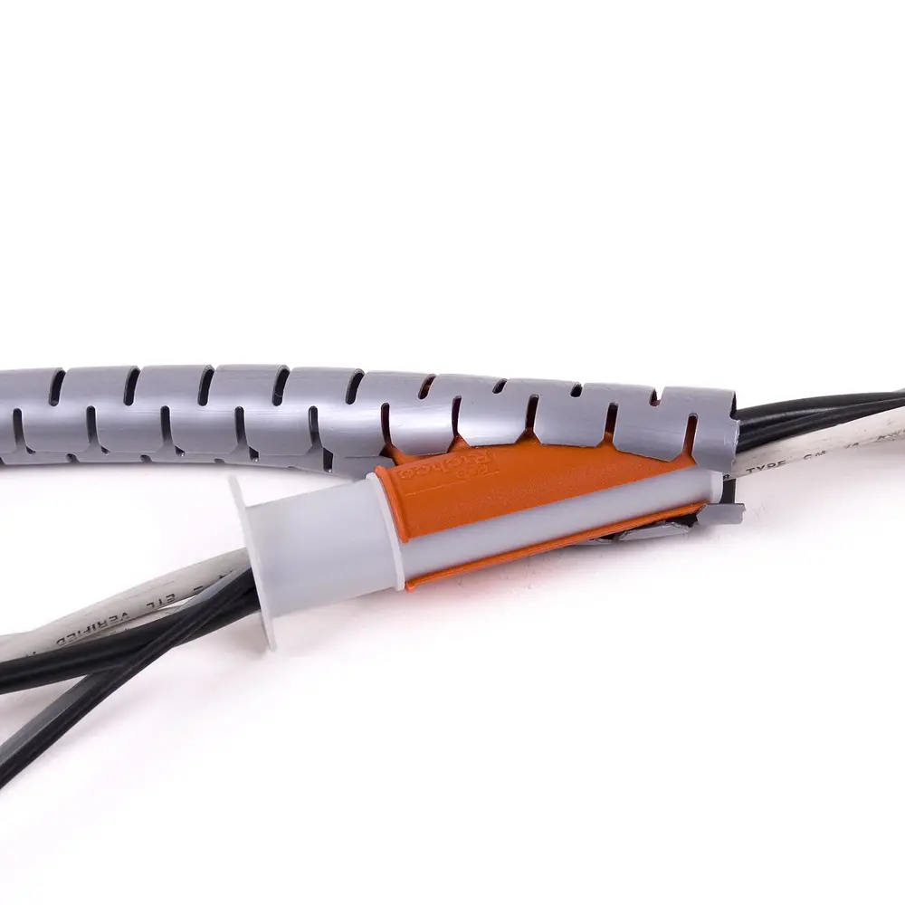 De Dataflex Cable Eater, ook wel spiraalslang of spirab genoemd, compleet geleverd met handig tooltje waarmee je de kabels snel in de kabelslang kunt plaatsen.