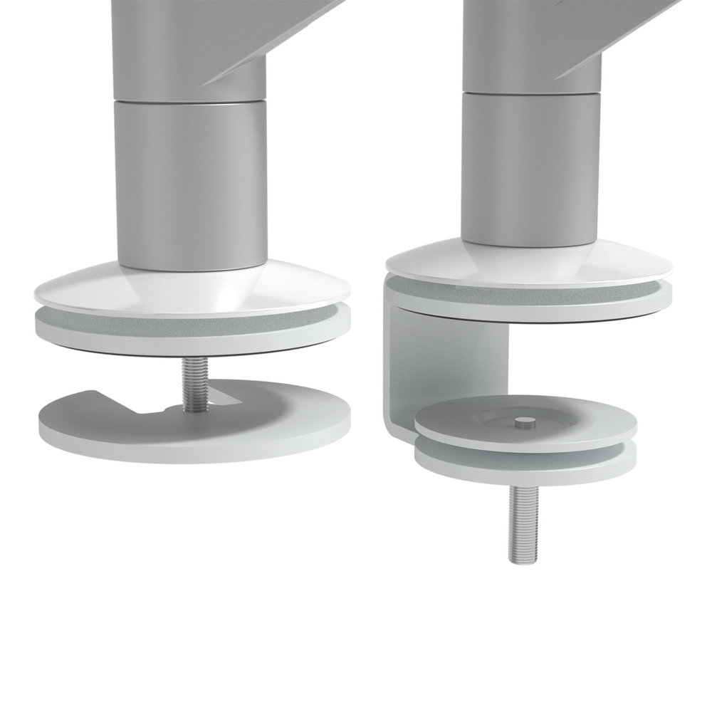 Je heb de keuze voor een bladdoorvoer, waarbij je de bekabeling volledig door de arm naar de onderkant van het bureau kan leiden of voor een bureauklem waarbij je de beugel aan de zijkant of achterkant van het bureau klemt. De bureauklem is geschikt voor bureaus met maximaal 40mm dik en bij het bladdoorvoer systeem kan het bureaublad maximaal 50mm dik zijn.