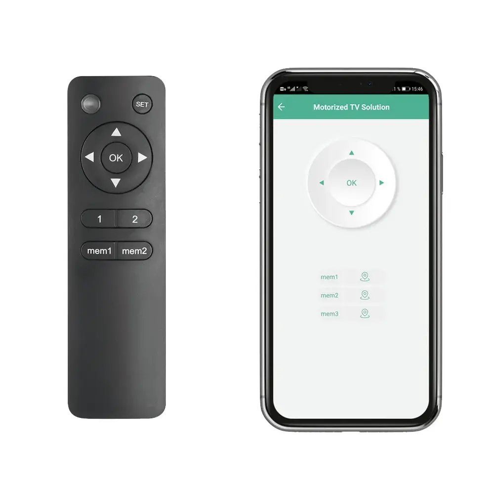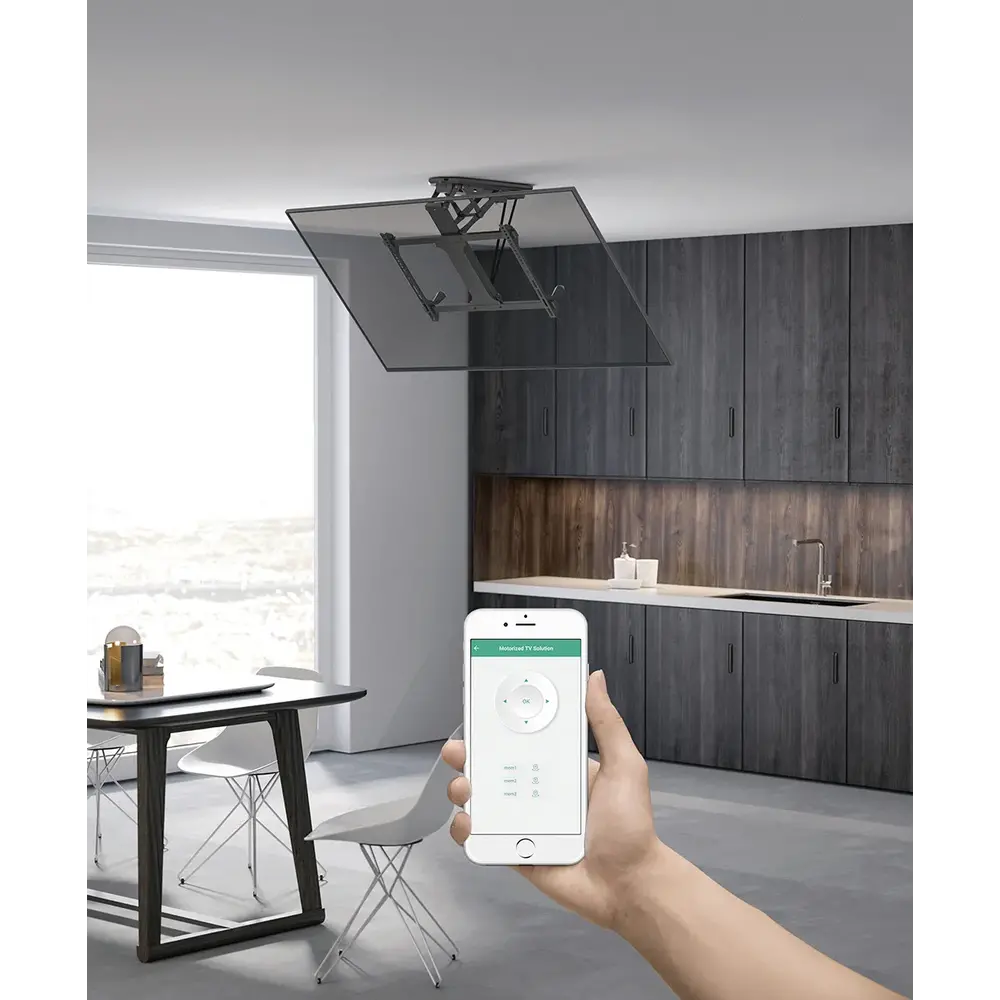 MyWall is de eerste fabrikant die deze Plafondbeugel presenteert in de "Smart" uitvoering een uitbreiding op het Smart Home programma. Je kunt de beugel overal vandaan bedienen met behulp van de Tuya App of de meegeleverde draadloze afstandsbediening. Je kunt eenvoudig dankzij een geheugen instelling een favoriete positie opslaan en vervolgens met één druk op de knop de beugel inklappen en weer terug naar de favoriete stand laten gaan.