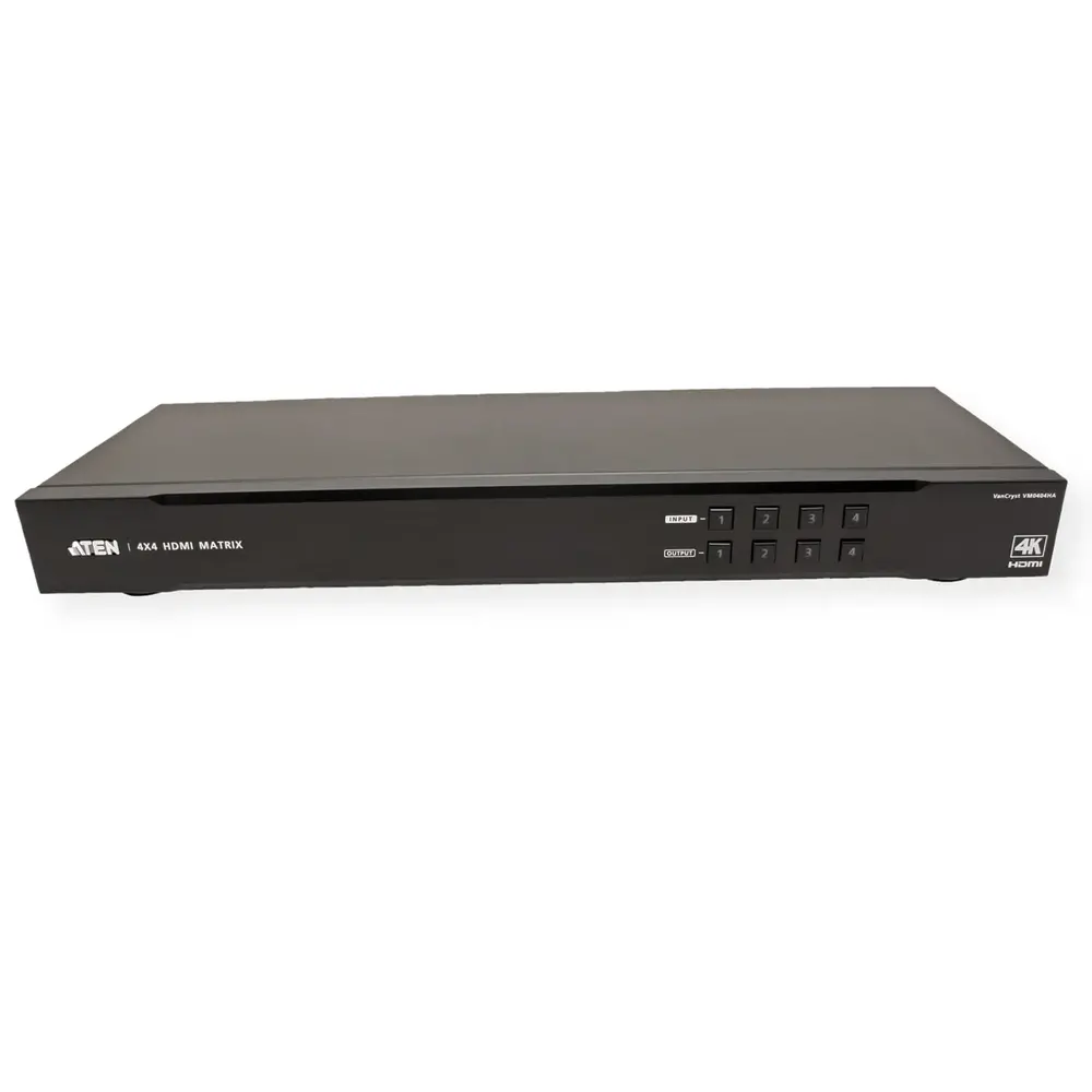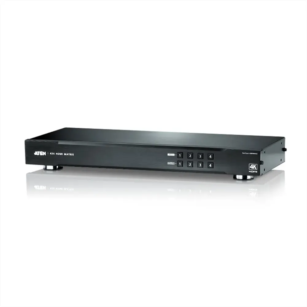 Een 4K HDMI switch en splitter in één, dat is wat een Matrix switch is. Deze HDMI matrix switch van Aten heeft 4 HDMI ingangen en 4 HDMI uitgangen. Zo kun je dus tot 4 HDMI apparaten aansluiten op 4 HDMI beeldschermen (Tv's, monitoren of projectoren) Eenmaal aangesloten, kan je onafhankelijk schakelen. Dat wil zeggen, je kan elk beeld op elke monitor onafhankelijk van elkaar schakelen. Dus bron 1 op beeldscherm 2 en 4, bron 2 op beeldscherm 1 en 3 of andersom enzovoort.
