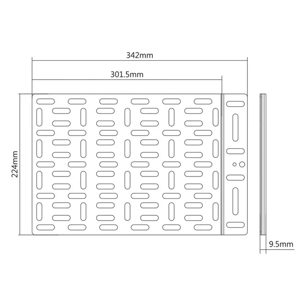 Op zoek naar een oplossing om een deel van je apparatuur netjes uit het zicht weg te werken? Deze plaat is speciaal gemaakt om je router, mediaspeler, gameconsole netjes op te hangen. Deze plaat heeft een totale afmeting van 340 x 224 x 9,5 mm en is gemaakt om een gewicht van 5 kg te dragen en kun je eenvoudig monteren op de wand (dus ook handig in meterkast bijvoorbeeld), op de VESA gaten aan de achterzijde van je TV of aan een wandbeugel.