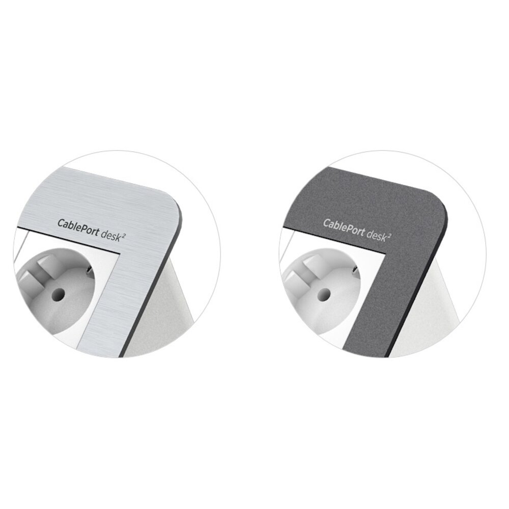 De CablePort desk² tafel opbouwsysteem zijn leverbaar in twee kleuren, een geanodiseerd aluminium (heel licht grijze) uitvoering en een gepoeder-coat grijs (RAL7015). De adapters zijn vooralsnog alleen in het wit verkrijgbaar, een zeer fraaie combinatie in zowel het grijs als het aluminium. De achterzijde is gesloten en altijd in het wit uitgevoerd. zodat je de bekabeling netjes als een bundel aan de onderzijde kan laten weglopen naar de grond.