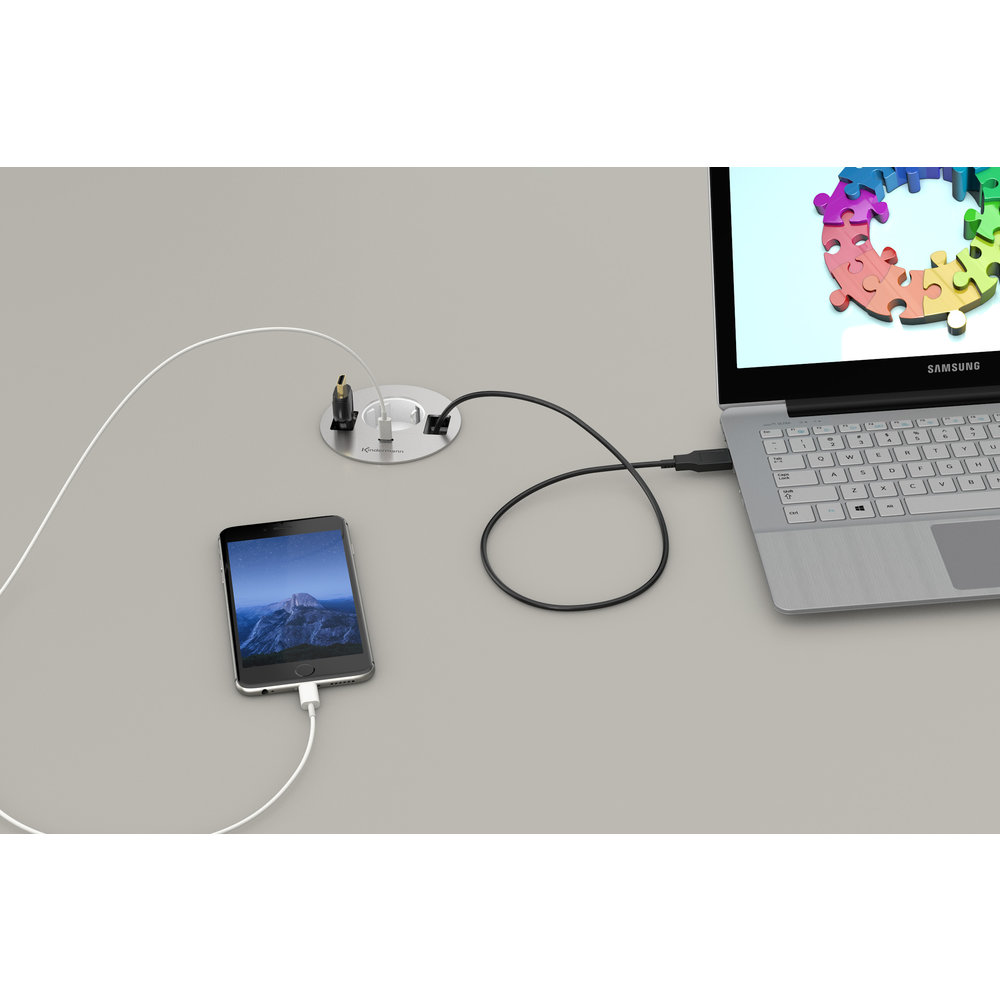 Een fraaie geborstelde RVS oppervlak en behoorlijk hufter-proof, dus ook ideaal voor in publieke ruimtes, zoals hotels, vliegvelden etc. Standaard uitgevoerd met een witte 220 Volt aansluiting en een 5V/2.1 A oplader met USB C, om je telefoon of tablet op te laden.De onderzijde is voorzien van een 3 meter stroomkabel met een Schuko kabel. De CablePort Table is geschikt voor bladdiktes van ongeveer 15 tot 60 mm. De uitsnijdingen voor de kabels zijn gaten van Ø 7.5 mm en daar kun je dus een gewenste kabel in plaatsen.