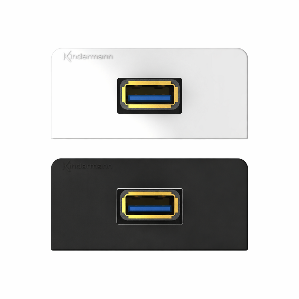 De USB A module is een half inbouwraam groot, hetgeen inhoud dat er dus 2 in één montageraam kunnen worden gemonteerd. Zo kun je er voor kiezen om zowel een USB A aansluiting als een HDMI aansluiting of een USB A en een Audio aansluiting in één montageraam te monteren. Je kunt dus meerdere aansluitingen in één wandcontactdoos bouwen, of dit nou in de wand, op de wand of in een wandgoot is, met het Konnect Design Click systeem van Kindermann is het allemaal mogelijk.
