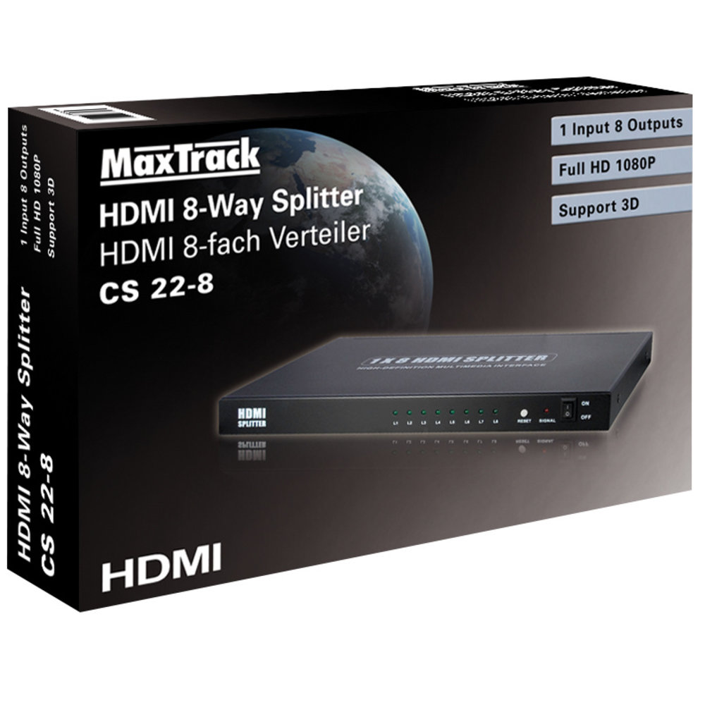 Deze 8 poorts HDMI splitter van Maxtrack is Full HD en 3D compatibel, ondersteund digitale audio signalen en heeft handshake memory. Je kan eenvoudig één computer op maar liefst 8 beeldschermen aansluiten. Het beeld zal simultaan op alle 8 de beeldschermen worden weergegeven, ideaal voor bijvoorbeeld indoor digital signage, maar uiteraard ook geschikt voor andere toepassingen. De prijs kwaliteit verhouding is ongekend, resoluties tot 1900x1200 pixels met een bandbreedte van 340 MHz en een snelheid tot 10,2 Gbps, onderscheid deze splitter zich van veel andere 4 poorts HDMI splitters.