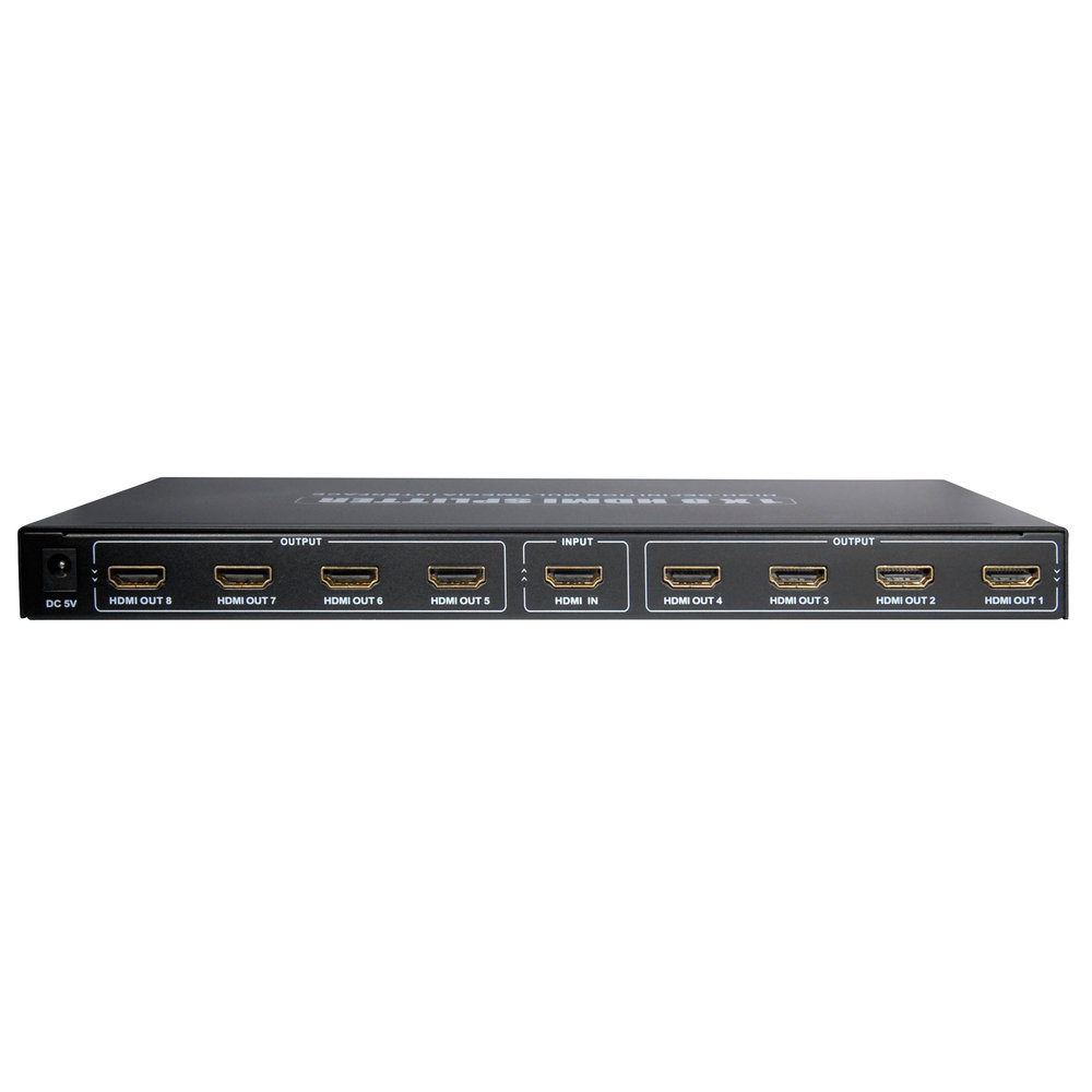 Ideaal dus voor ruimtes waarin de afstanden redelijk zijn en er op meerdere schermen hetzelfde beeld getoond moet worden, biedt deze 8 poorts HDMI splitter uitkomst. De splitter heeft vergulde contacten en wordt door een externe adapter (5V DC) gevoedt en is verder een plug & play apparaat.
