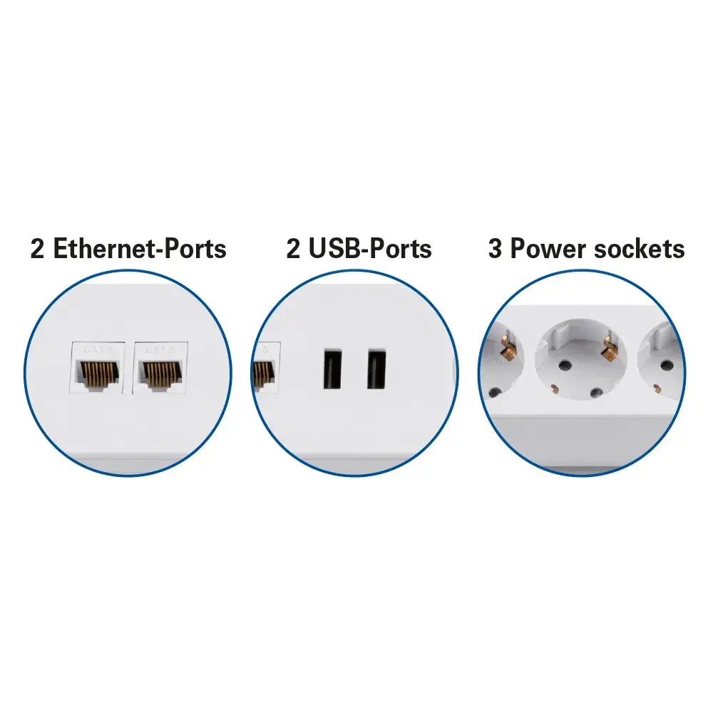 • 2x RJ45, 2x USB Lader, 3x Schuko Stroom