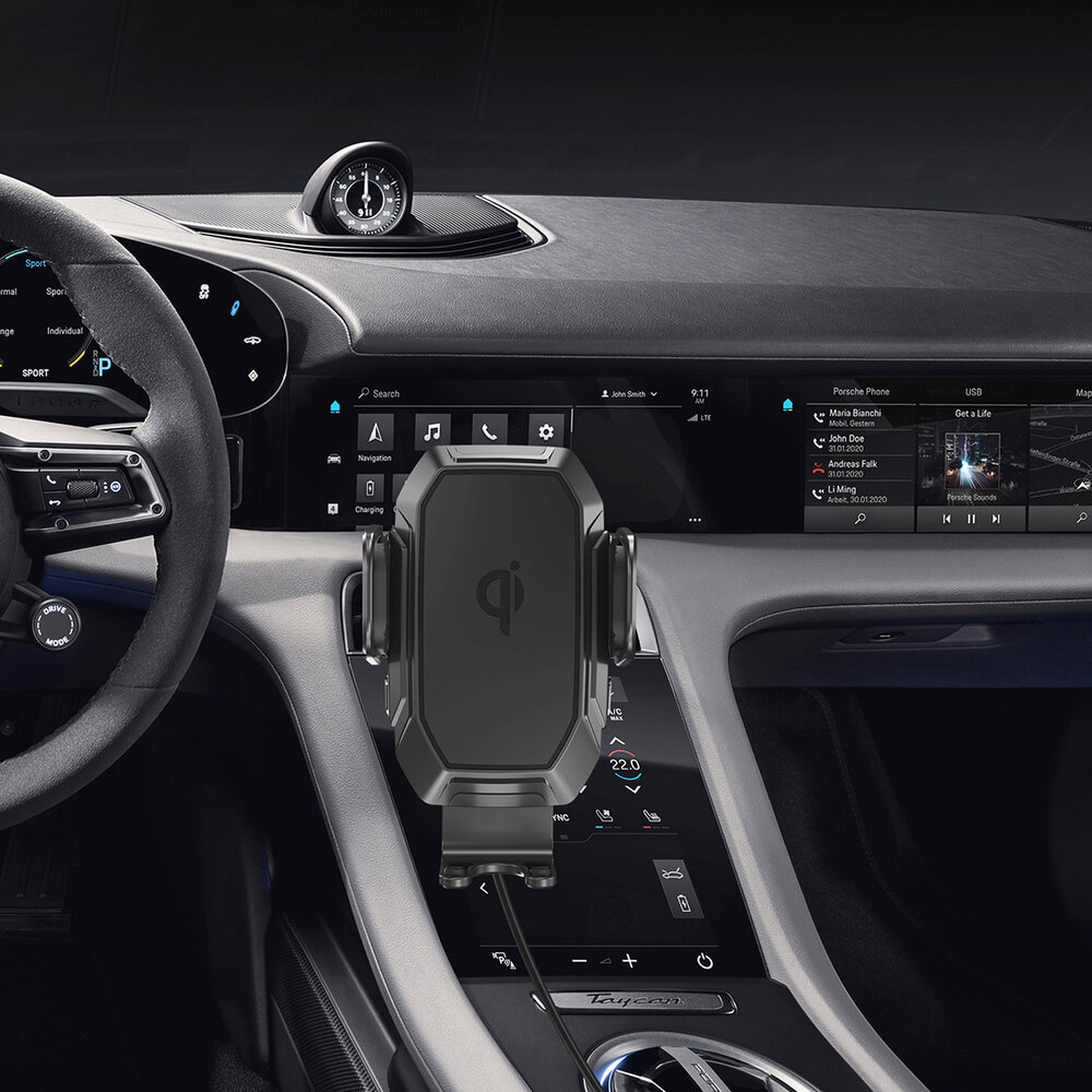 Naast de grote flexibiliteit in ophanging en positie, is hij ook voorzien van een draadloze oplaadfunctie, je zult dus nooit een lege telefoon hebben onderweg, wat zeker in het geval van navigeren wel heel erg prettig is. Door de telefoon in de houder te klemmen en vanaf de houder de USB C kabel aan te sluiten op de USB poort in de auto, zal hij in korte tijd volledig worden opgeladen het is een snellader (Qi snellaadfunctie 15 Watt), dus het de telefoon zal in een vrij snel tempo weer vol zijn. De USB C kabel die mee wordt geleverd is 1.0 meter lang.