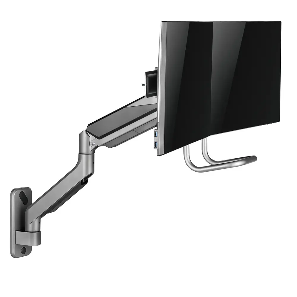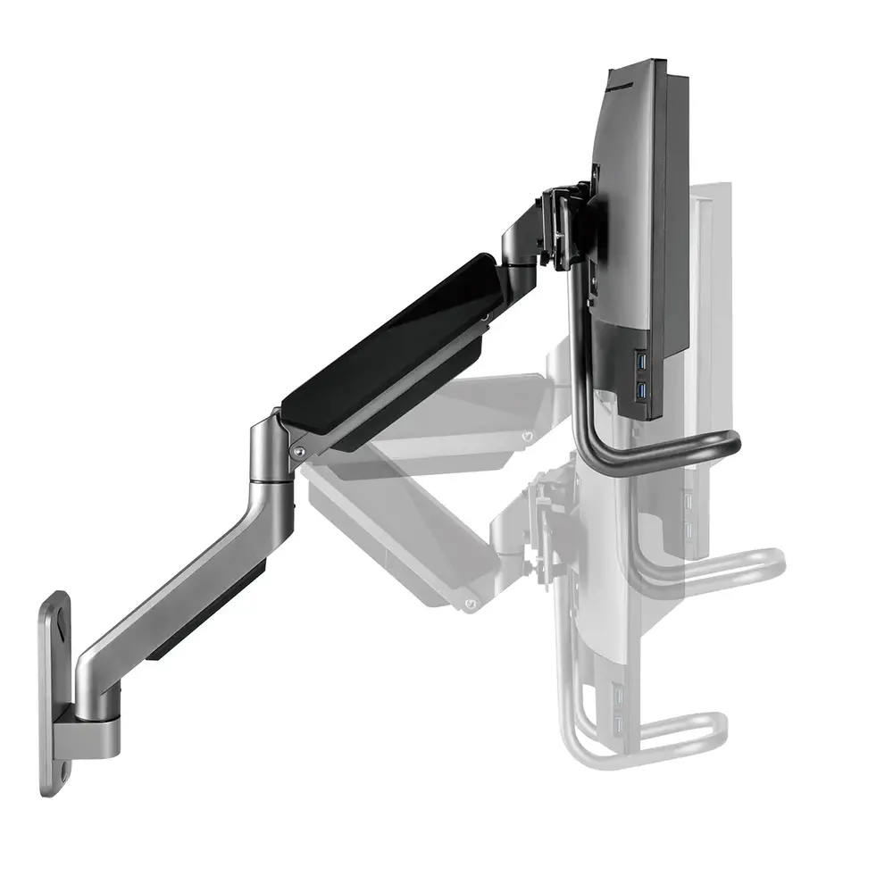 Een wandbeugel voor 2 schermen met een zeer luxe uitstraling dankzij de zeer fraaie grijze kleur die "Space Grey" wordt genoemd. Een monitor muurbeugel voor 2 schermen die van alle gemakken voorzien is, een ideale oplossing voor werkplekken die tegen de wand aan staan. Waarbij je vaak liever geen klem aan je bureau heb, omdat je immers het bureau netjes volledig tegen de wand aan kunnen schuiven en ook een bureausteun met een bladdoorvoer is dan wellicht niet prettig, omdat je toch in je werkblad moet gaan boren in dat geval en ook totaal niet nodig.