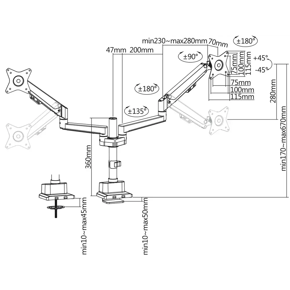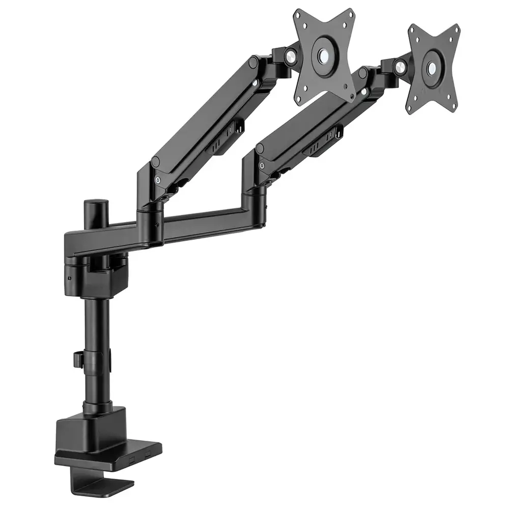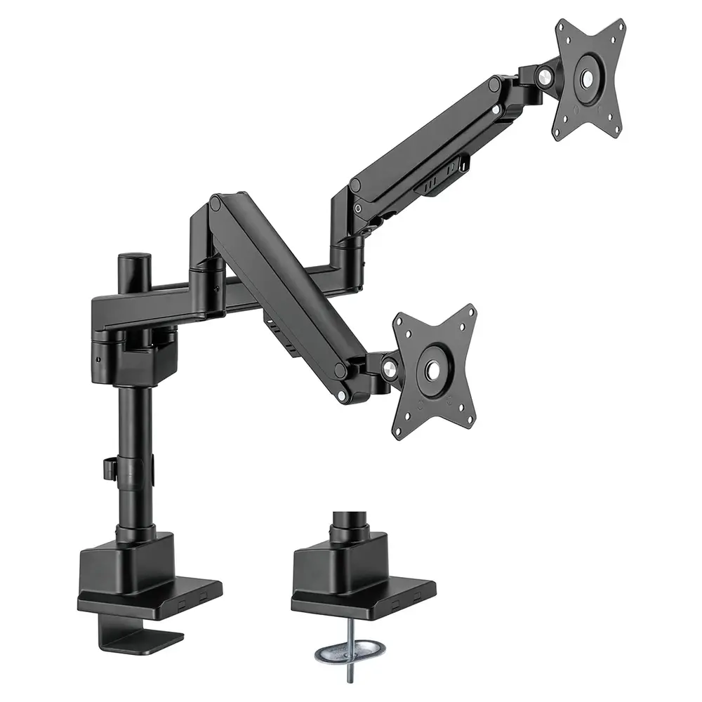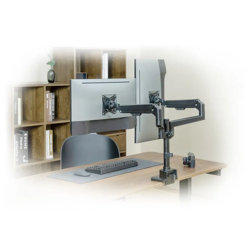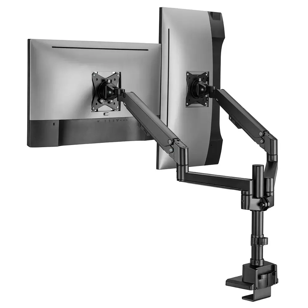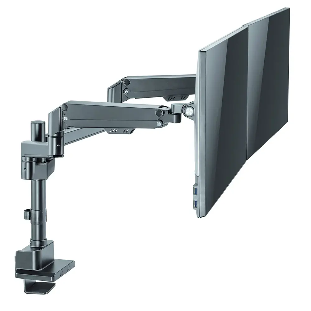 Een monitorarm waarbij je de monitoren altijd op de juiste hoogte kunt afstellen, dankzij een paal van 355mm in combinatie met 2 vrij lange armen die volledig gestrekt op 460 mm komt en op het laatste stuk van de arm voorzien zijn van een gasveer. Daarmee kun je eenvoudig de hoogte verstellen. Een zeer flexibele monitorarm voor 2 schermen. Waarbij je de hoogte van de monitorarm al deels op de paal zelf kunt bepalen en ook nog eens zelf kunt bepalen of de het eerste deel van de arm wel of niet gebruikt gaat worden. Deze kun je er namelijk ook tussenuit laten.