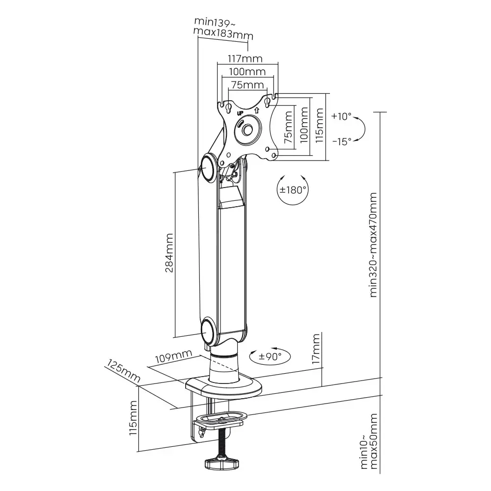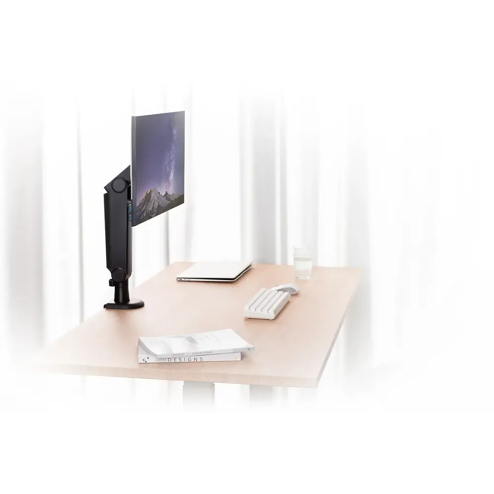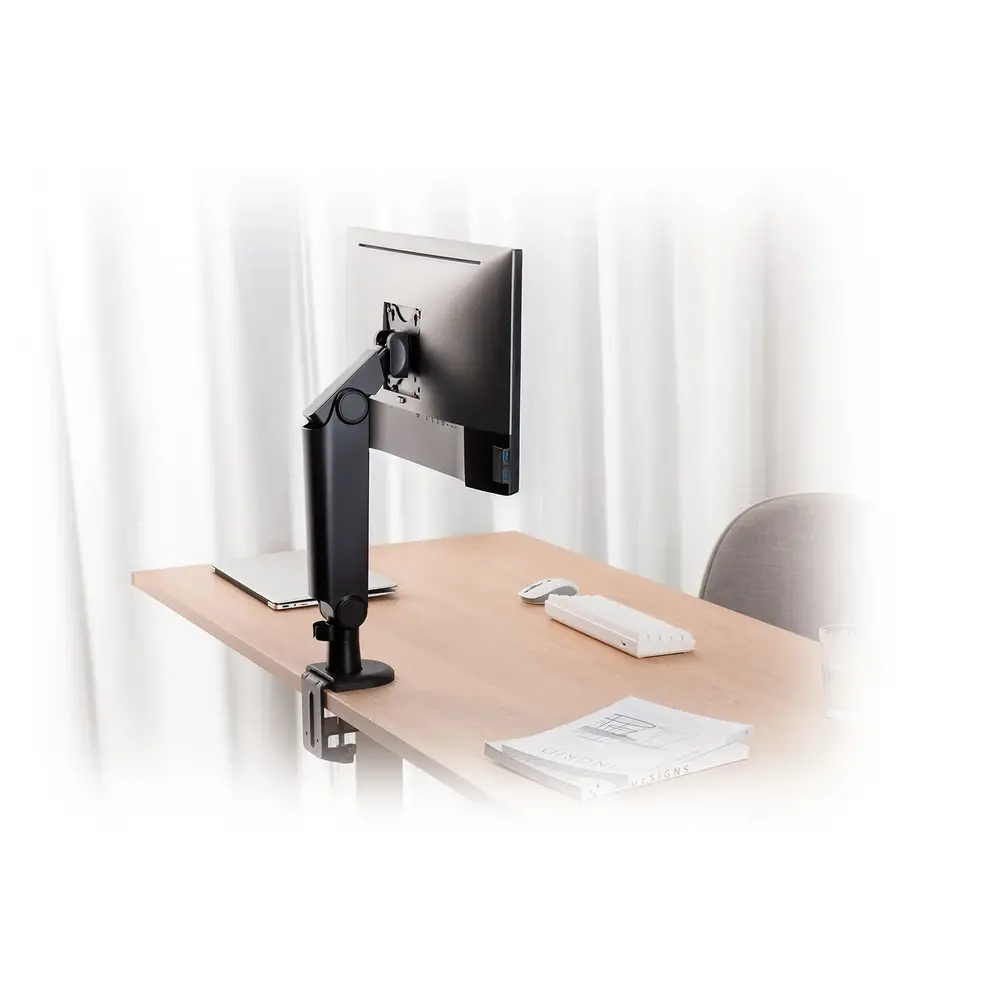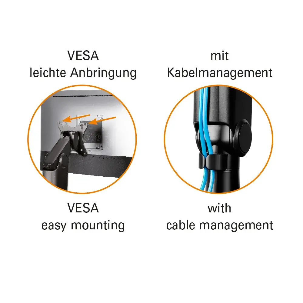 Is een monitorarm die ontworpen is om zoveel mogelijk ruimte te besparen, maar toch een optimale ergonomie en flexibiliteit te behouden. Een paal met een vaste klem en een speciaal veersysteem waarmee je de hoogte van de monitor (hart VESA) toch zeer eenvoudig kunt verstellen tussen de 320 mm tot maximaal 470 mm. Na het aanhangen van de monitor kun je met een inbussleutel de veer op de juiste kracht afstellen, waardoor je simpel handmatig de monitor in hoogte kunt verstellen naar de optimale hoogte.