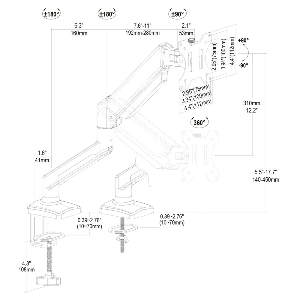 | Draaien: | +90°/-90° bij de monitorzijde, +180°/-180° middenste arm, +180°/-180° bij de voet |