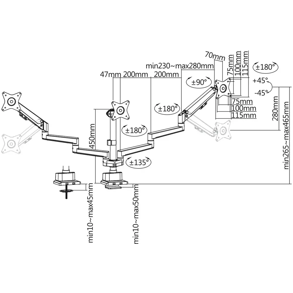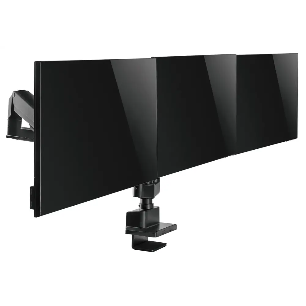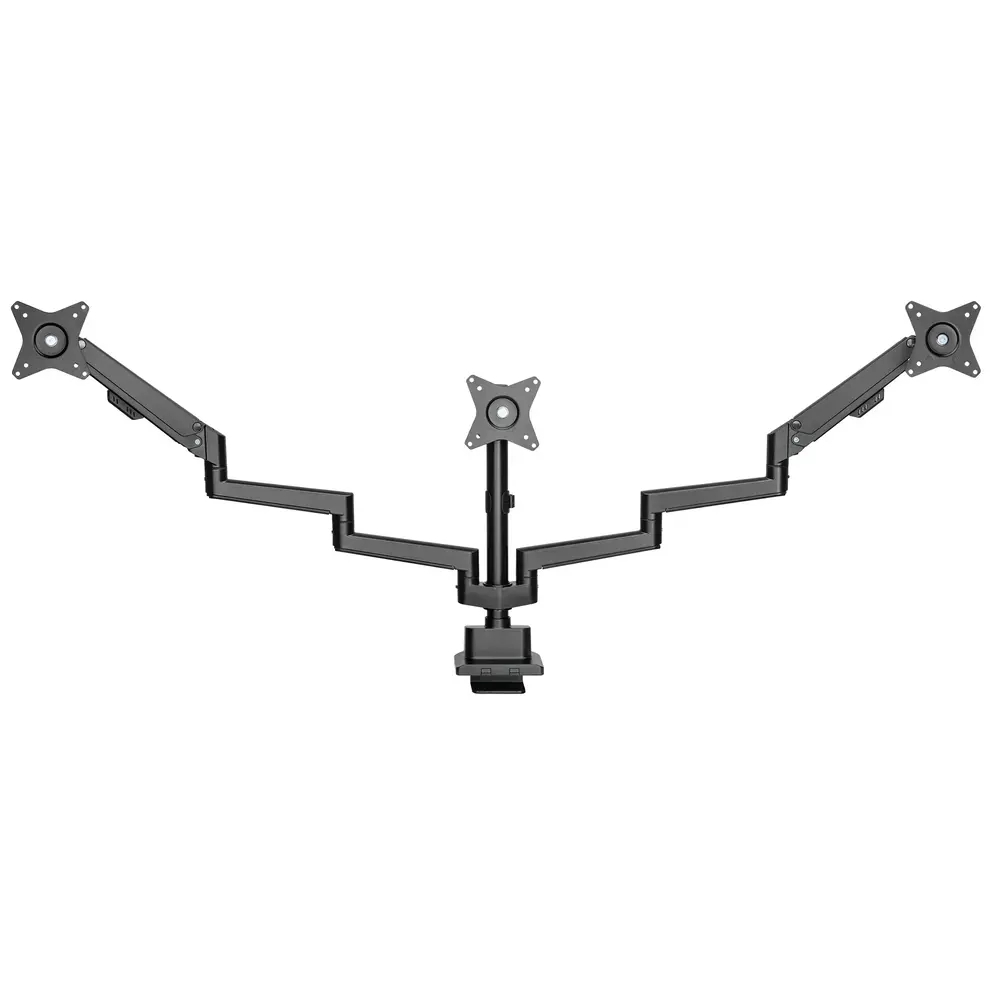 De meest flexibele monitorarm voor 3 schermen in ons assortiment, met 2 lange armen voor de buitenste schermen, die voorzien zijn van een gasveer. Daardoor kun je met deze 2 monitoren alle kanten op. Je plaatst het middelste scherm op de juiste hoogte en stelt de buitenste schermen zo af, hoe je ze wilt hebben. Dankzij de lengte van de monitorarmen is deze geschikt voor schermen van 15 t/m 30 inch met een gewicht van minimaal 1 kg, tot maximaal 7 kg.