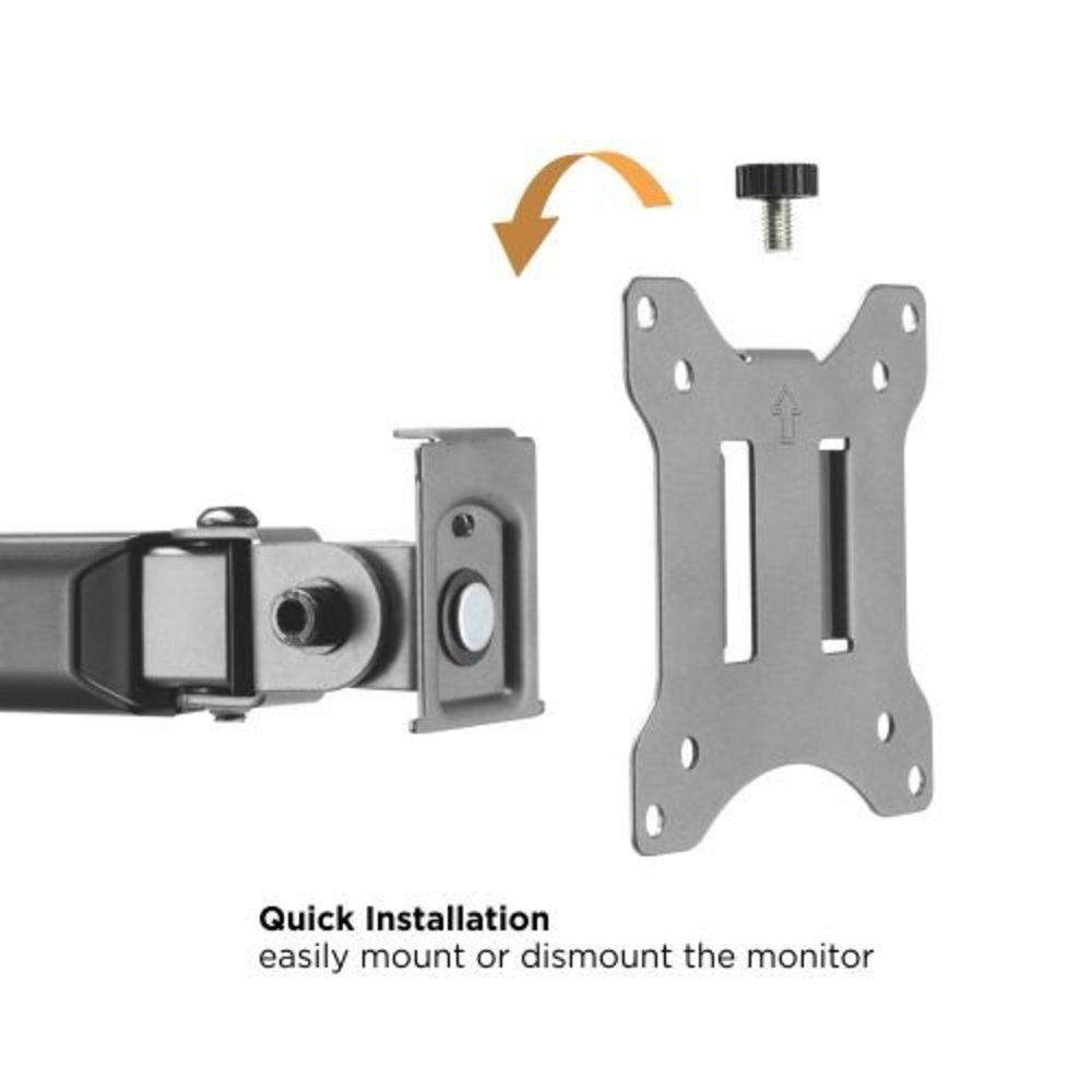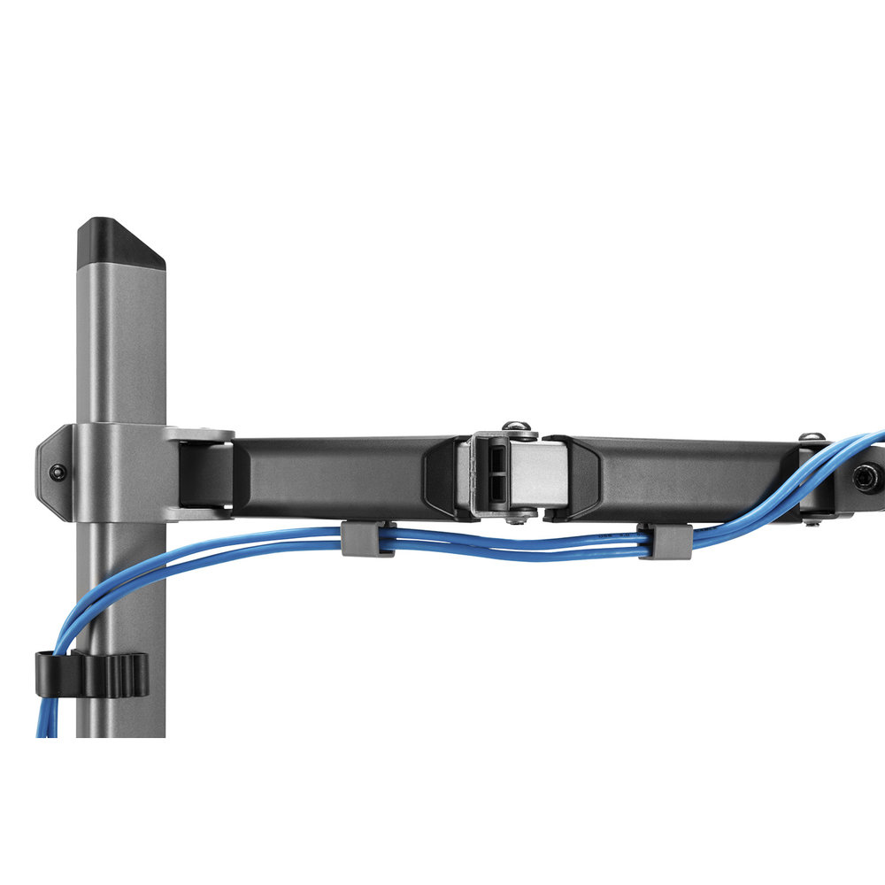 Een zeer veelzijdige monitorarm, geleverd met zowel bladdoorvoer, als een bladklem. Een fraaie space grey, smokey kleur en geschikt voor schermen van maximaal 9 kg. Je kunt het scherm in totaal +70°~-70° kantelen, op 3 punten +90°~-90° draaien en +180°~-180° roteren om van landscape naar portrait te gaan en weer terug. De bekabeling kan netjes via de daarvoor bestemde klemmen worden gebundeld en netjes worden begeleid naar de onderkant van het bureau. De VESA beugel die bevestigd wordt aan het scherm is voorzien van een Quick Release systeem, waarmee je dus eenvoudig het scherm van de arm kunt monteren en demonteren.