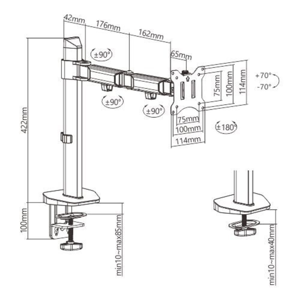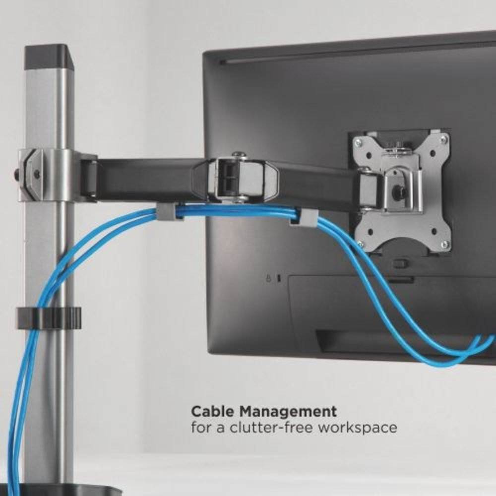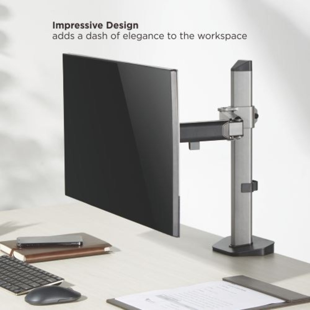 Een enkele monitorarm met een zeer luxe uitstraling en veel mogelijkheden om je monitor snel in een prettige positie te stellen, zodat je de optimale werkpositie zo heb gevonden. Een scharnierende arm met een totale lengte van 380 mm met meerdere draaipunten, de mogelijkheid om het scherm te kantelen en de mogelijkheid om de hoogte eenvoudig in te stellen. De arm is verstelbaar van +/- 0 tot 42 cm hoog en daarmee dus ook het hart van het VESA gatenpatroon op het scherm. Geschikt voor schermen met een VESA gatenpatroon van 75 x 75 mm en 100 x 100 mm.