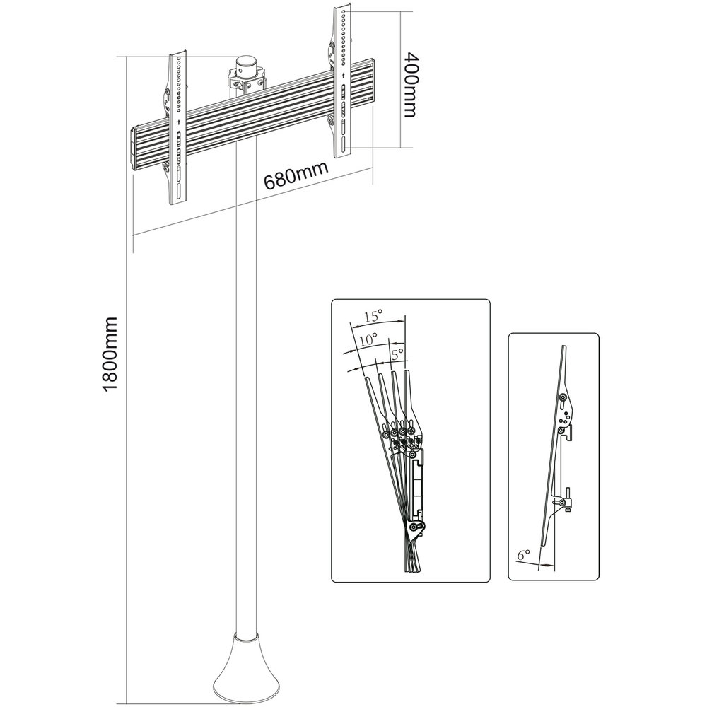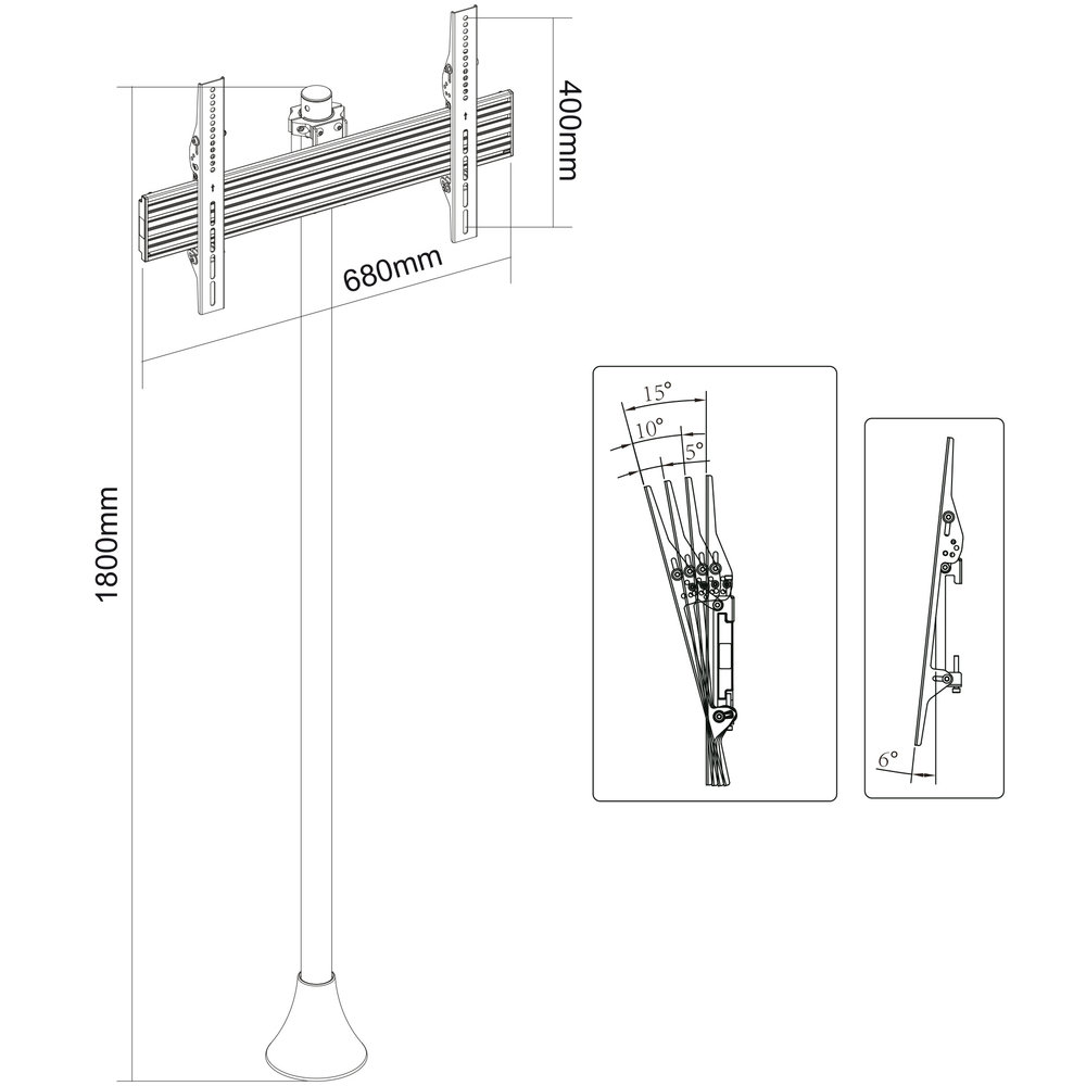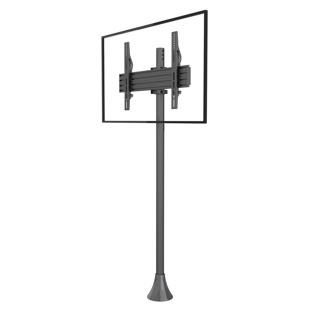 Een sterke stalen constructie, met een stevige en goede vloermontage plaat welke met de meegeleverde schroeven in de grond kan worden bevestigd. Je kunt de TV draaien en je kunt het scherm zowel in portrait als in landscape monteren. De totale hoogte van de paal is 1800 mm. De buis is 50 mm doorsnee en voorzien van kabelkanalen, de bekabeling kun je dus netjes aan de achterkant uit het zicht houden en zo naar de vloer brengen.