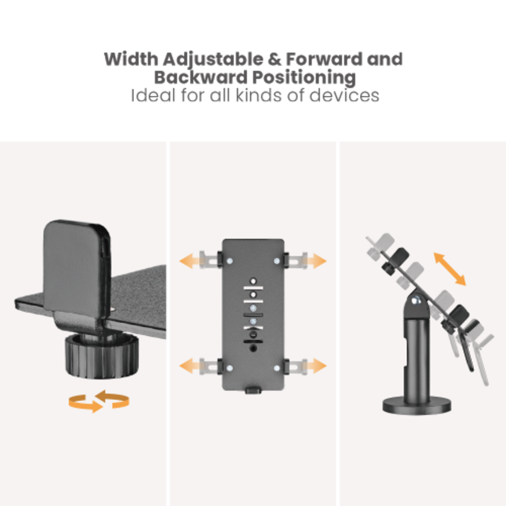 Daarnaast is de terminal houder eenvoudig te kantelen en draaien met behulp van de hendel aan de onderzijde. Hij kan zowel links om als rechtsom volledig om zijn as draaien en dan ook nog 45° voorover of achterover gekanteld worden. Hij is dus altijd voor de gebruiker en de aanbieder prettig benaderbaar. Zonder enig gereedschap heb je eenvoudig de juiste positie gevonden.