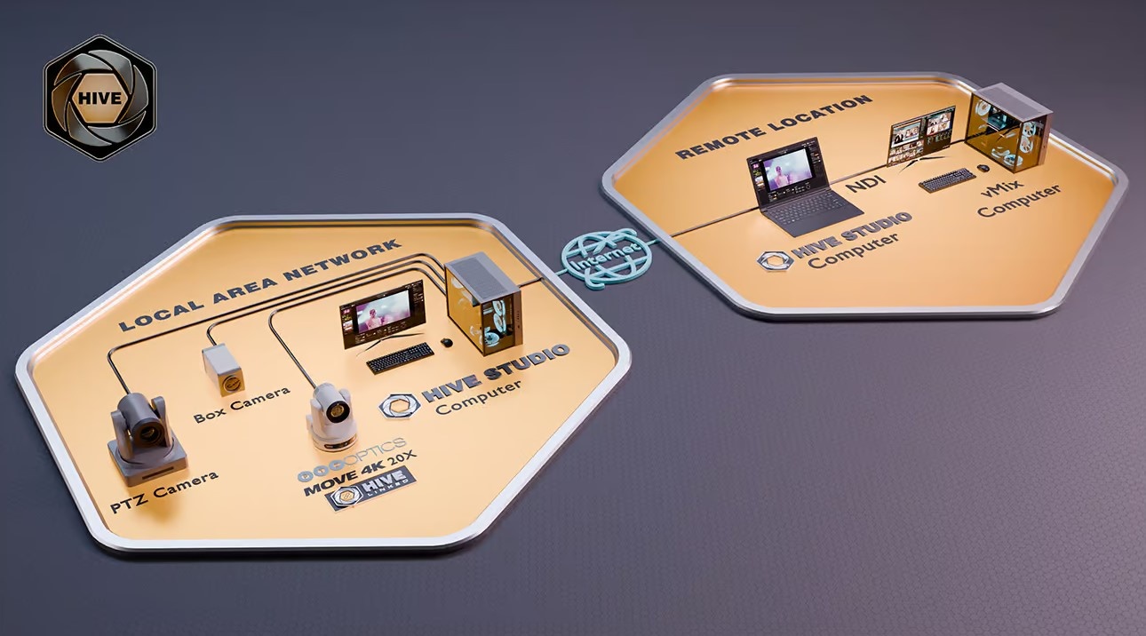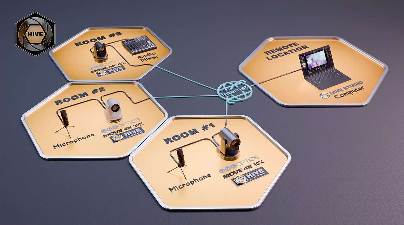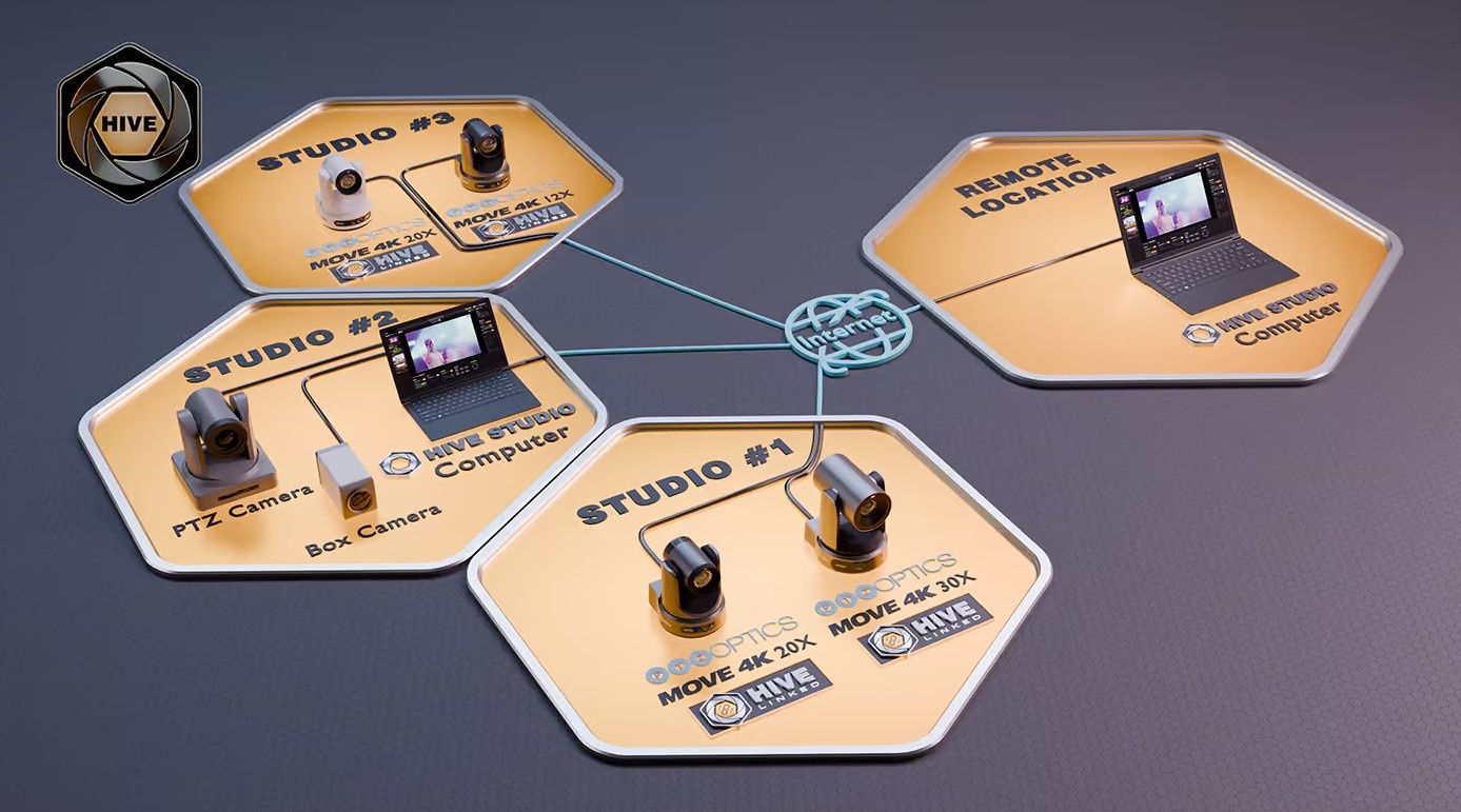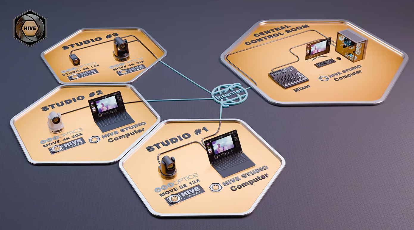 Hive Linked camera's, wat alle huidige serie PTZOptics Camera's zijn, maken rechtstreeks verbinding met Hive. Daardoor zijn er geen computers meer nodig op locatie. Dit betekent dus, dat als de camera's op het netwerk zijn aangesloten, jij vanuit elke plek op de wereld kunt inloggen op Hive, de betreffende locatie/studio selecteert en de bediening kunt doen.