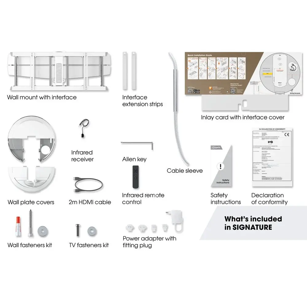 Het Cable Inlay System (CIS®) in de draagarmen verbindt, beschermt en verbergt je kabels tussen de muur en je tv. Verder heeft de TVM 7675 tv beugel geïntegreerde kabelhouders. Hierdoor kun je aan de achterzijde van je tv kun je tot wel bijna 4 meter kabel opbergen en met een afdekplaat netjes uit het zicht houden. Je hebt ook de mogelijkheid om kabels in de muur te laten verdwijnen door een voorbereiding in de muurplaat van de tv beugel. De HDMI kabel (2m) om de MotionMount automatisch te laten werken bij het in- en uitschakelen van de tv ontvang je erbij. Daarnaast leveren we een infrarood afstandsbediening met ontvanger in de verpakking mee en kun je de DrillRight™ AR App gratis downloaden om het eerste boorgat af te tekenen.