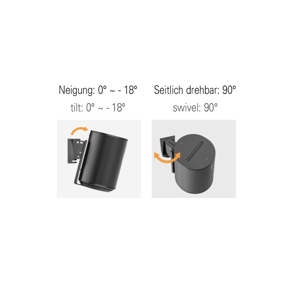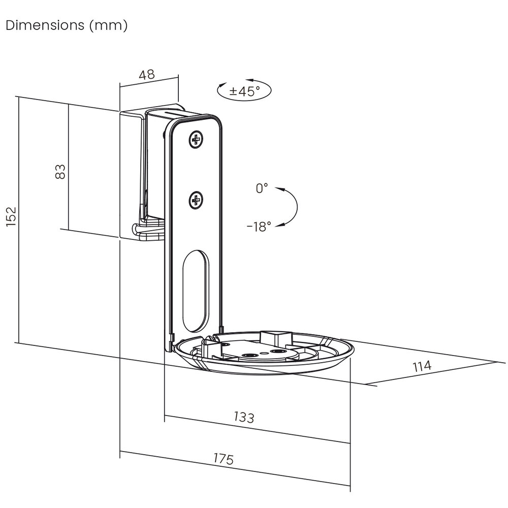 Een set van 2 beugels, speciaal ontworpen voor de Sonos Era 100, optimaal af te stellen doordat je de speaker 18° voorover kunt kantelen en +45° naar links of rechts kunt draaien. Een compacte beugel die per 2 stuks geleverd wordt. Een compacte wand ophanging met een wandplaatje van slechts 48 x 83 mm. De totale beugel heeft een lengte van 152 mm en komt in totaal van wand tot voorzijde beugel 175 mm uit de wand. De bekabeling kan netjes via de opening aan de achterzijde uit het zicht worden weggewerkt.