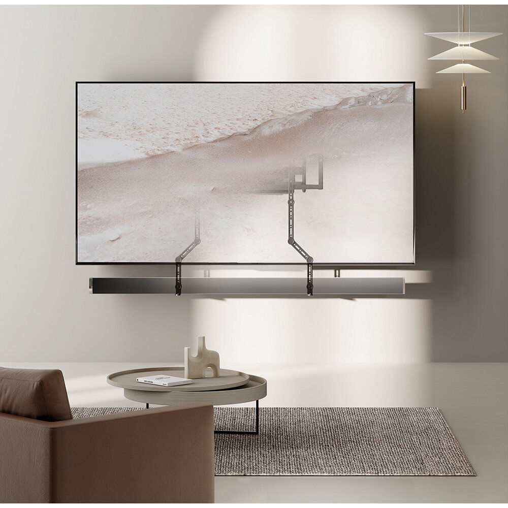 Met deze universele soundbar bracket kun je een hele brede range aan soundbarren aan je TV of de TV beugel bevestigen. Je kunt ervoor kiezen om de Soundbar boven of onder de TV monteren. De Soundbar beugel monteer je dus aan de TV beugel of aan de TV en vervolgens stel je de flexibele armen zo af dat de onderzijde uit komt op de gaten van de soundbar. De beugel is voorzien van dempende pads die trillingen en resonantie van de soundbar voorkomt voor een optimaal geluid.