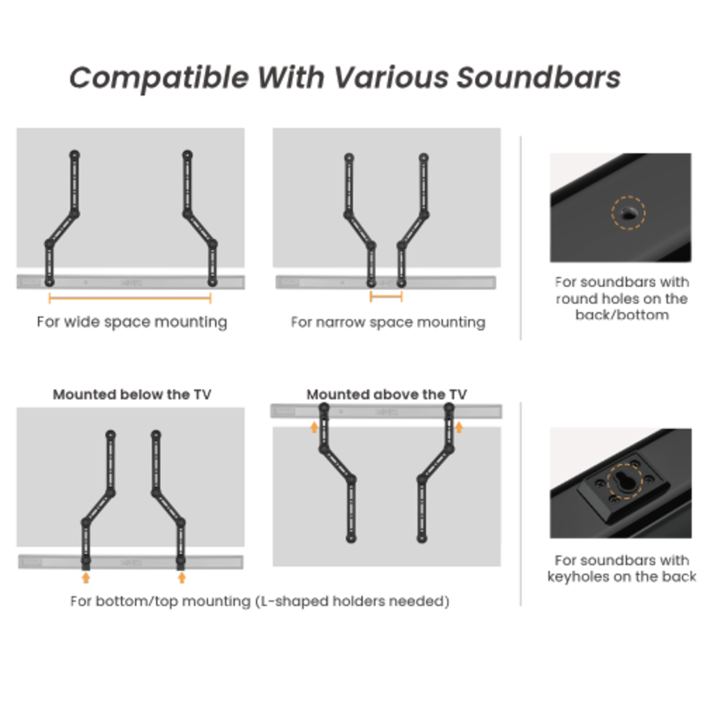 De beugel wordt geleverd met L-Shape beugeltjes, dus ook de meeste Soundbars waar de ophanggaten aan de onderzijde van de soundbar zitten kunnen worden opgehangen met deze universele soundbarbracket. Het fraaie van een oplossing als deze, is dat als je TV aan een draai en kantelbare beugel hangt de soundbar dus ook mee draait met de TV en dat het dus niet uitmaakt hoe je de TV draait, de audio altijd optimaal van de voorzijde zal komen.