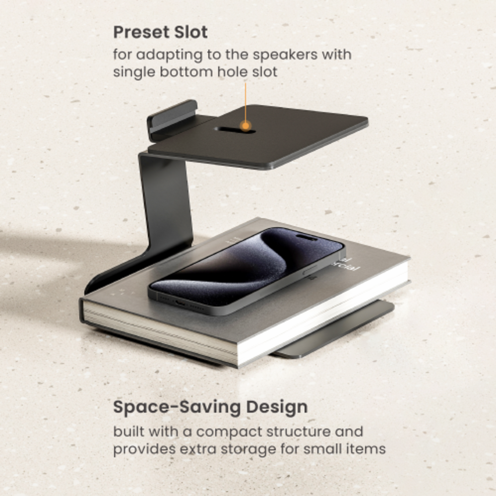 Een eenvoudige speakerstandaard voor de middelgrote speakers, geleverd in een set van 2 standaarden. De speakerstandaard is verhoogd, wat een ruimte besparende functie geeft en ervoor zorgt dat het geluid op een betere hoogte komt op je werkplek, of bij de TV kast, die vaak toch iets lager zijn. De speaker tafelstandaard heeft een verstelbare oppervlakte van 140 t/m 190 mm diep en een breedte van 125 mm en je kunt je speaker eenvoudig aan de standaard klemmen met behulp van een schroef. De standaard is voorzien van een anti vibratie oppervlakte om het maximale uit je speakers te kunnen halen en tegen resonantie. Daarnaast is hij voorzien van een vilt, zodat ook je bureau of kast waar je de speakers plaatst niet beschadigd.