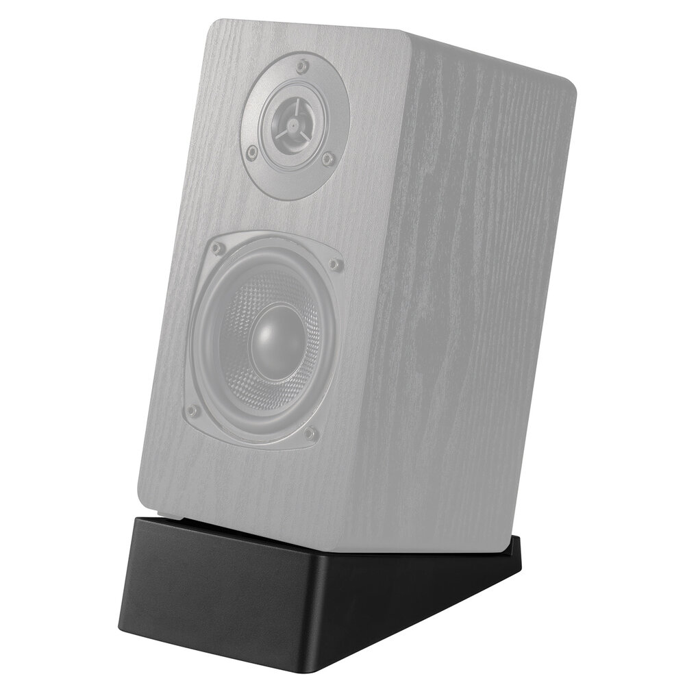 Een speakerstandaard die ontworpen is om het geluid van je speaker op het bureau, je dressoir of ladekast te optimaliseren. Gemaakt van trilling dempend TPR materiaal. Die ervoor zorgt dat ongewenste trillingen en resonantie geminimaliseerd worden. Dankzij het open ontwerp is hij geschikt voor vrijwel elke kleine (sateliet) speaker. Een afmeting van 122 mm breed een diepte van 195 mm, wordt de voorzijde 56 mm omhoog gelift, waardoor je dus een hoek van 15° heeft en bij een normale werkplek bijvoorbeeld volgens berekeningen het geluid goed richting de oren gericht.