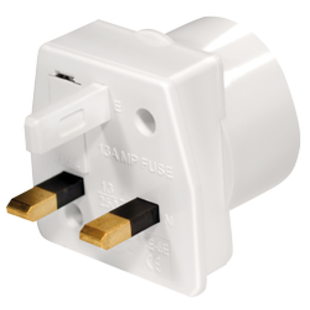 Een reisadapter die geschikt is voor alle stopcontacten in Engeland en vrijwel elke voormalige engelse kolonie, zoals Engeland, Hong Kong, VAE, Cyprus, Malta, Maleisië en Singapore etc. Aan de voorzijde voorzien van een Europese Schuko aansluiting. Aan de achterzijde van de 3 polige Engelse stekker