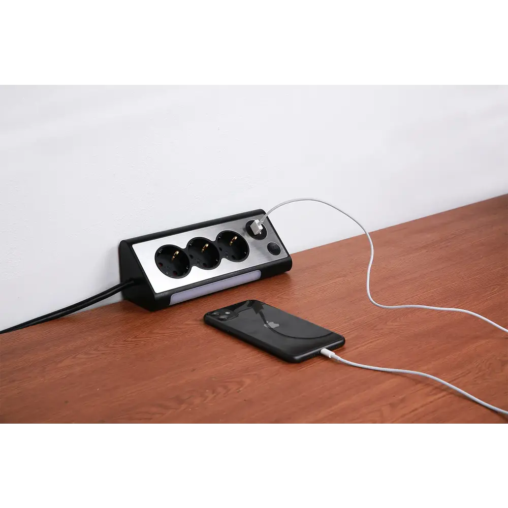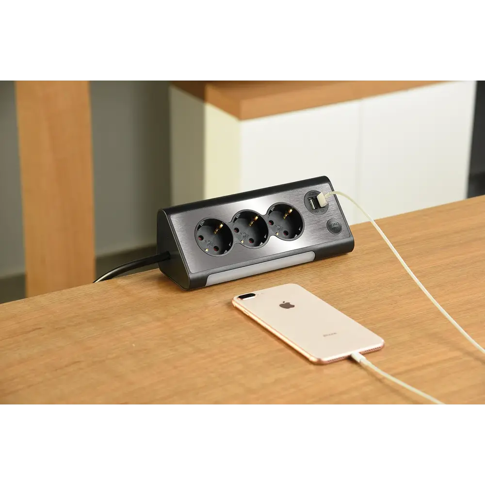 Uiteraard doet deze tafelcontactdoos aan alle normen en zijn ook alle contacten voorzien van kinderbeveiliging. Een fraai design met 3 stopcontacten, wat vaak voor de meeste werkplekken wel meer dan genoeg is en bovendien kun je, je telefoon of je tablet opladen, maar dankzij de 2.1 Ampère, kun je er niet alleen kleine apparaten, maar ook zelfs de iets grotere zoals bijvoorbeeld tablets, computers of laptops mee opladen.