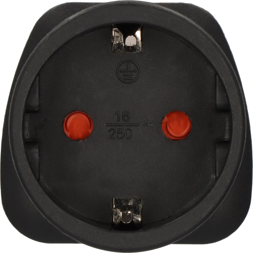 Een geaarde reis adapter die geschikt is om apparaten met een "Europese" stekker aan te sluiten op en systeem dat men in Engeland kent ofwel Type F female naar Type G male.