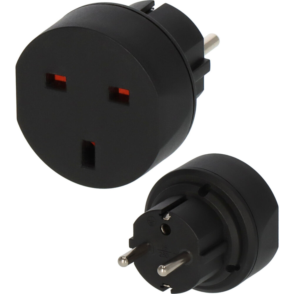 Een geaarde reis adapter die geschikt is om apparaten met een "Engelse" stekker aan te sluiten op en systeem dat men in Europe kent ofwel Type G female naar Type E en of F male.