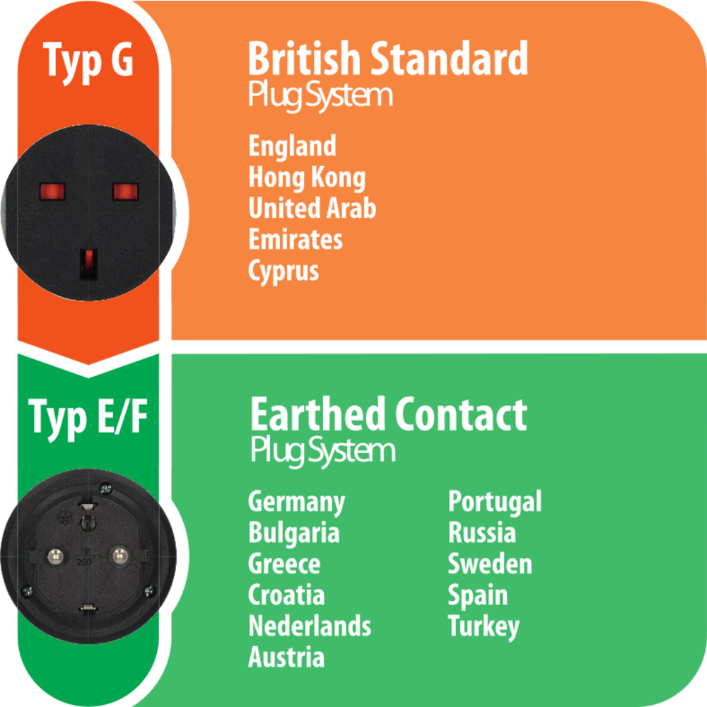 Type E is onder andere geschikt voor Nederland, Duitsland, Bulgarije, Griekenland, Kroatië, Oostenrijk, Portugal, Zweden, Spanje, Rusland en Turkije. Type F is geschikt voor Frankrijk en België, waar sommige stopcontact voorzien zijn van een penaarde, ook daar is deze adapter geschikt voor.
