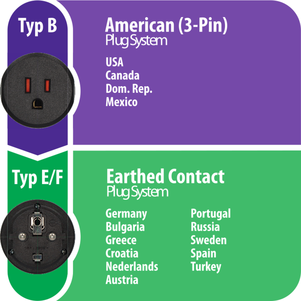 Type E is onder andere geschikt voor Nederland, Duitsland, Bulgarije, Griekenland, Kroatië, Oostenrijk, Portugal, Zweden, Spanje, Rusland en Turkije. Type F is geschikt voor Frankrijk en België, waar sommige stopcontact voorzien zijn van een penaarde, ook daar is deze adapter geschikt voor.