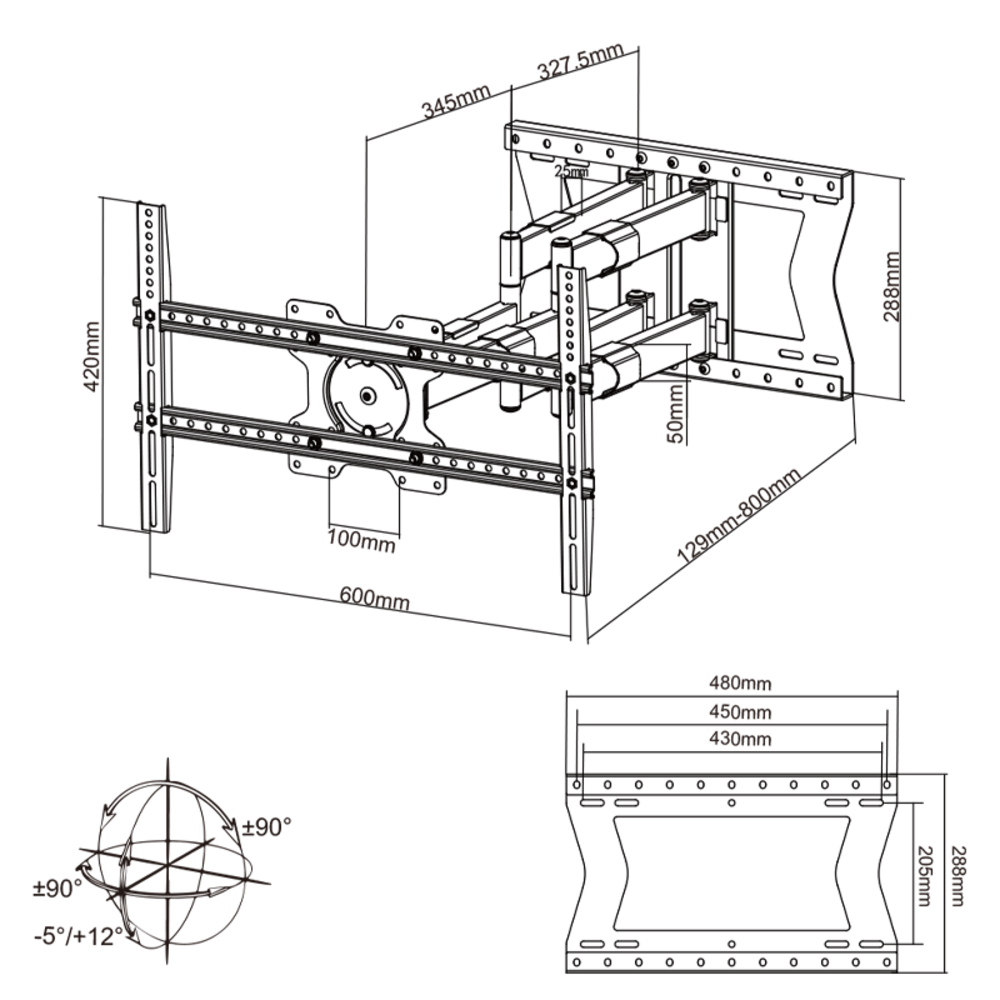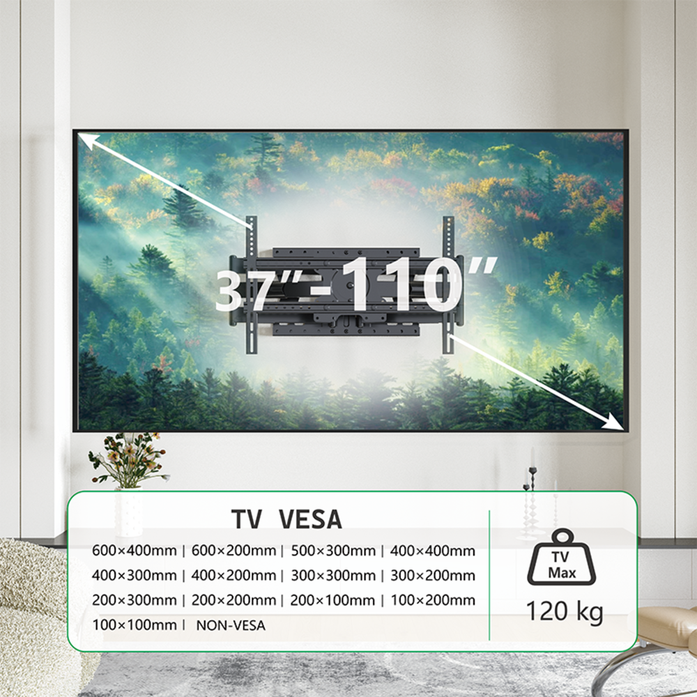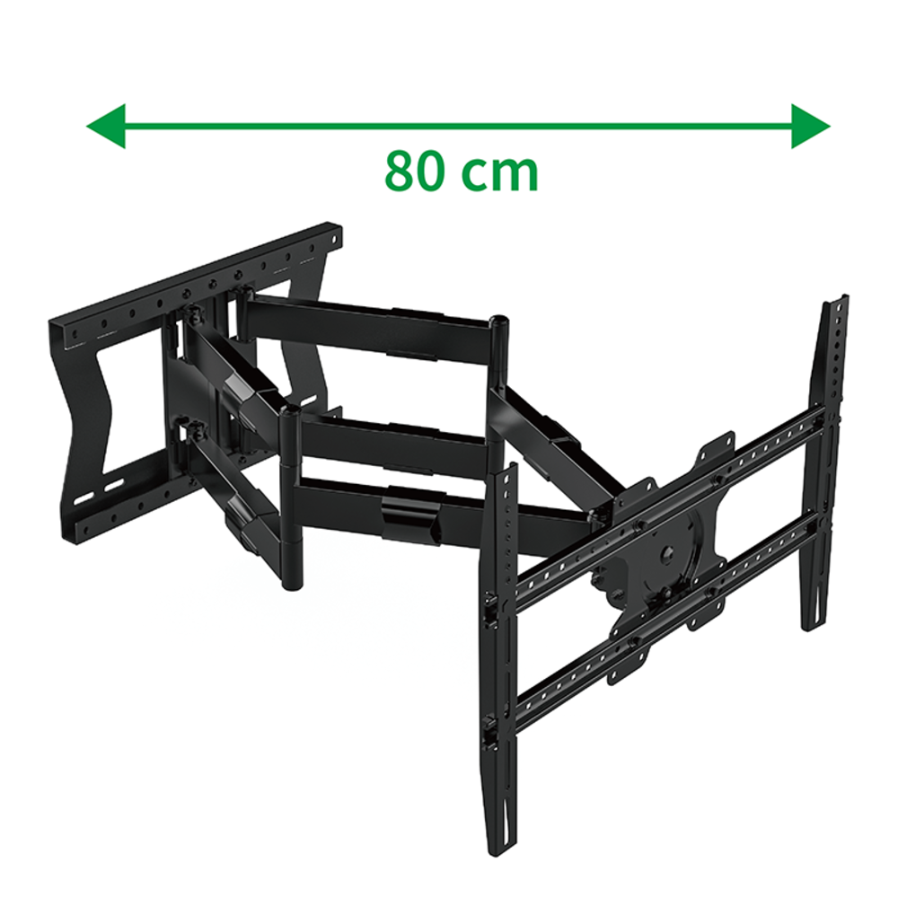 Een TV beugel met een grote afstand tot de wand voor de grote en zwaardere jongens. Met een dubbele arm van maar liefst 80 cm is deze TV beugel geschikt voor schermen tot maximaal 110 inch, met een maximaal gewicht van 120 Kg. De maximale VESA maat van de TV kan tot 600 x 400 mm zijn. Je kunt na het ophangen het scherm dus niet alleen tot maximaal 100 cm van de muur afhalen, maar ook nog eens naar kantelen (+12° / - 5°), naar links en naar rechts draaien ( +90° / -90°) en roteren . Dus van landscape (horizontaal) naar portrait (verticaal) te draaien.