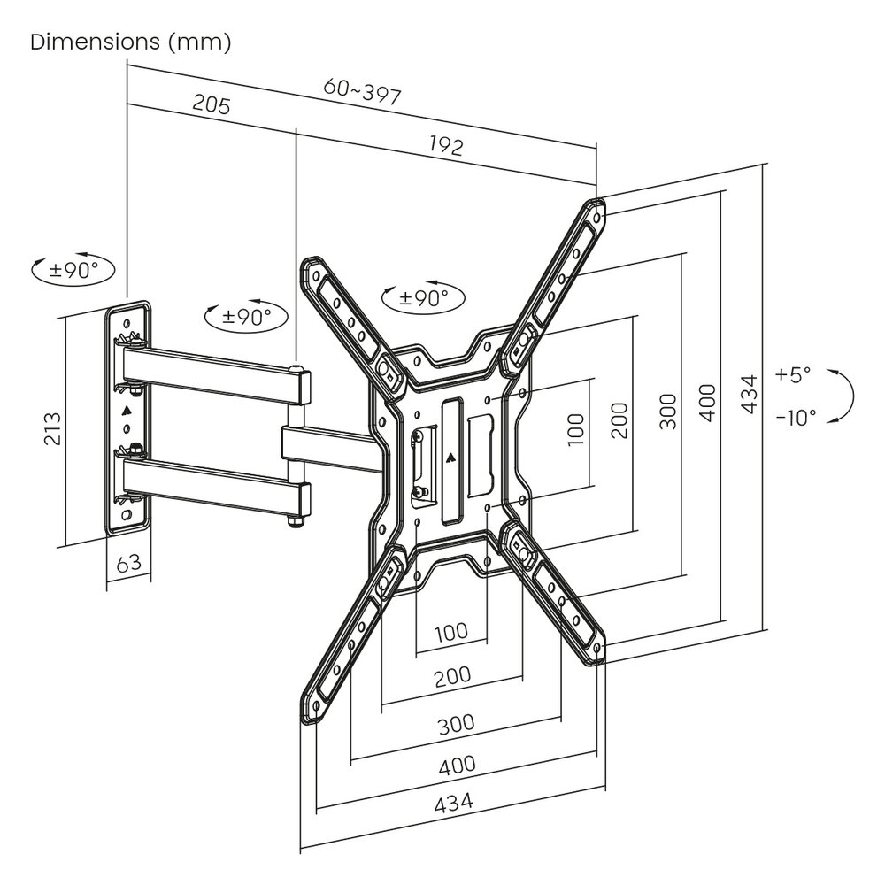Draai -en kantelbare wandbeugel (+90°/-90° draaibaar op 3 punten, kantelbaar +5°/-10°)