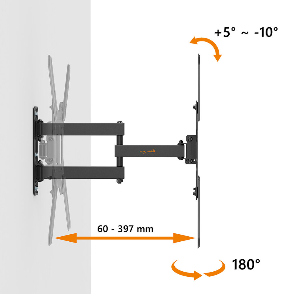 Een eenvoudige TV wandbeugel waarmee je vrijwel alle kanten op kunt. Relatief strak tegen de wand als hij is ingeklapt (60 mm) en tot 397 mm naar voren kunt halen. In tegenstelling tot de TV beugel HEG 5 L kun je bij deze TV beugel dankzij de dubbele arm wel recht naar voren en recht naar achter bewegen.