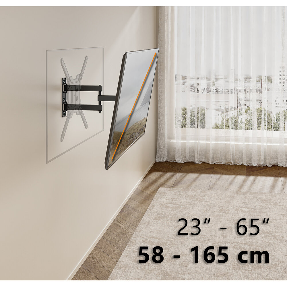 Wanneer je de meestal TV relatief strak tegen de wand wilt hebben, maar toch wel volledige bewegingsvrijheid wilt hebben of bieden aan de klanten. Dan biedt deze TV beugel wel uitkomst. Dit kan zijn tuis in de woonkamer of de slaapkamers, maar ook in hotelkamers of in vakantieparken is dit een uitstekende TV beugel om te gebruiken. Ingeklapt komt de TV slechts 60 mm van de wand en je kunt hem uittrekken tot 397 mm van de wand, waardoor je toch behoorlijke bewegingsvrijheid zal hebben.