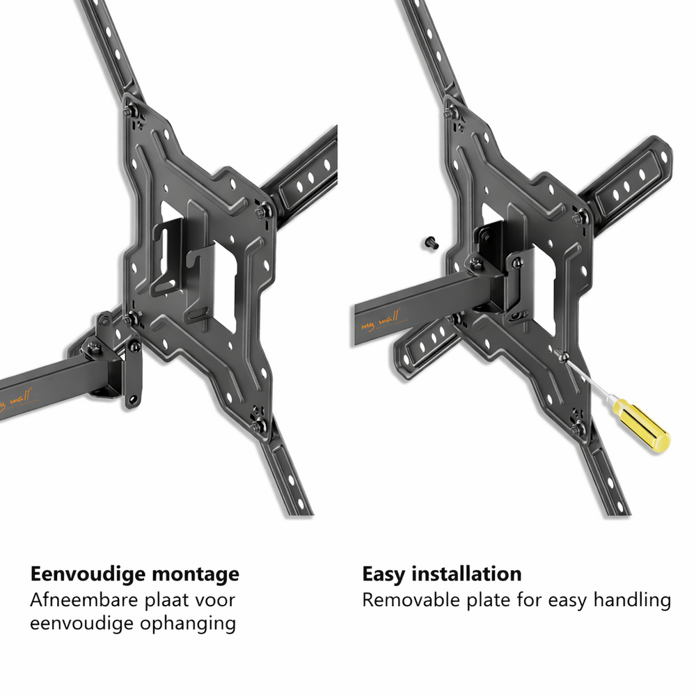 Een TV beugel die zeer eenvoudig te installeren is, je bevestigd de wandplaat aan de muur, vervolgens hang je de arm erin. Je stelt de VESA bracket met de armen op de juiste VESA maat in. Deze monteer je op de TV en vervolgens hang je de TV met de plaat aan het deel op de wand met de arm. Wil je de TV er nog even afhalen, dan is dit eenvoudig te doen. Dankzij je de volledige VESA plaat zo met het scherm van de beugel af kunt tillen.