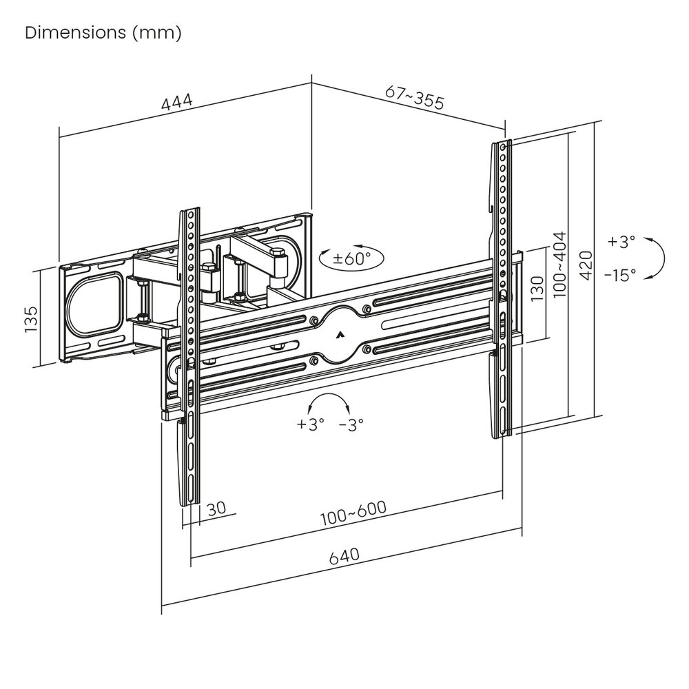 Een wandbeugel waarmee je de flexibiliteit hebt om het scherm te draaien en kantelen en je het scherm eenvoudig recht naar voren of naar achter kunt halen. De afstand tot de wand is wanneer je de beugel volledig ingeklapt hebt slechts 67 mm en volledig uitgestrekt 355 mm. Volledig uitgestrekt kun je het scherm tot maximaal 60° links -of rechtsom draaien om zo een fijne kijkhoek te hebben.