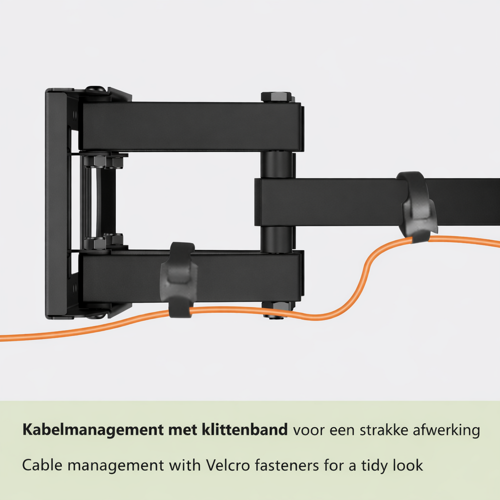 Je kunt de bekabeling vanaf de achterzijde van de TV met behulp van de meegeleverde klittenband kabelbinders netjes langs de armen naar de wand brengen. Uiteraard is het verstandig om even voldoende lengte over te laten, zodat het scherm de vrijheid heeft in de beweging. Vanaf de wandplaat kun je dan de bekabeling netjes in een kabelgoot brengen, om zo een nette installatie te hebben met een zogenoemde "Clean Look".