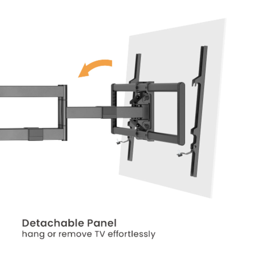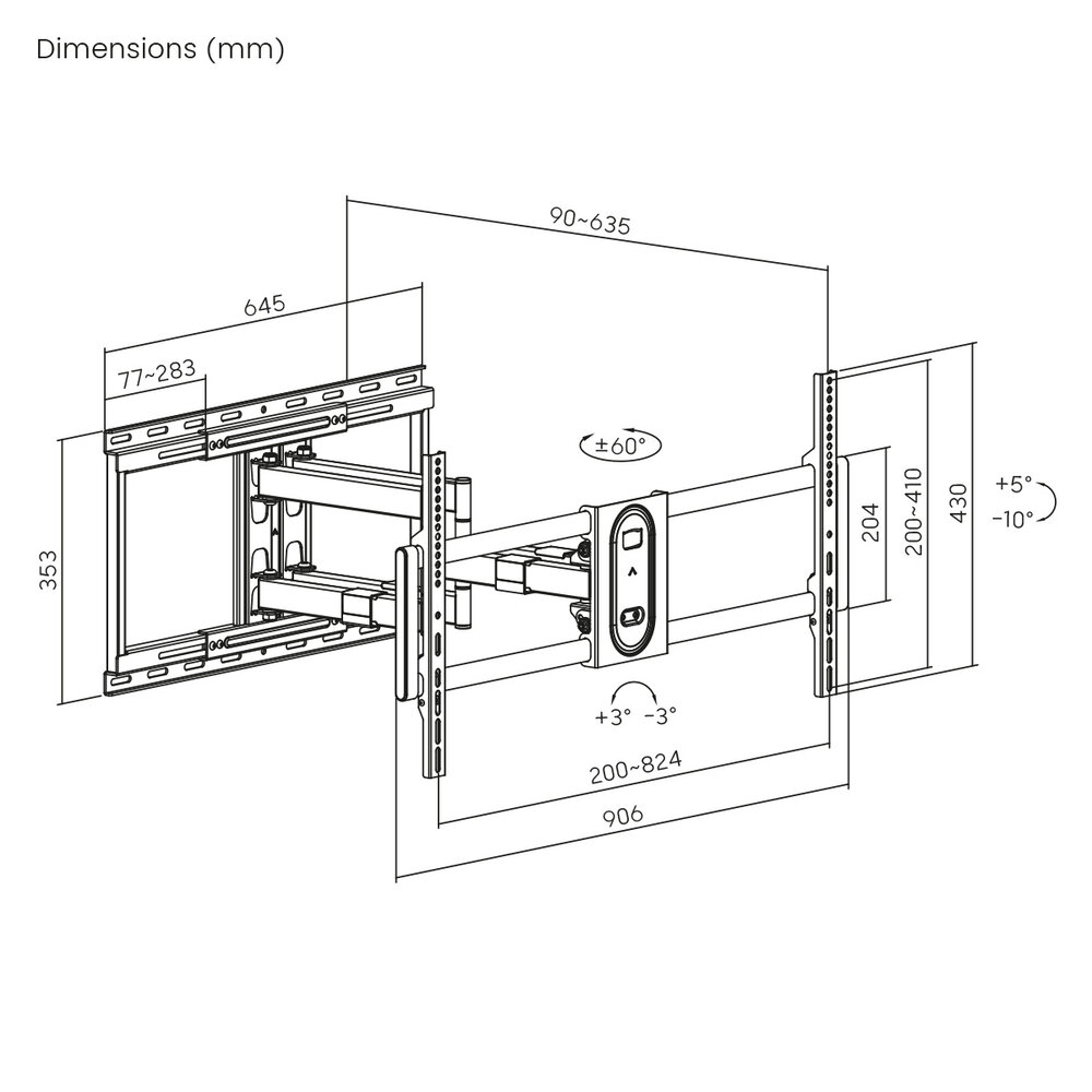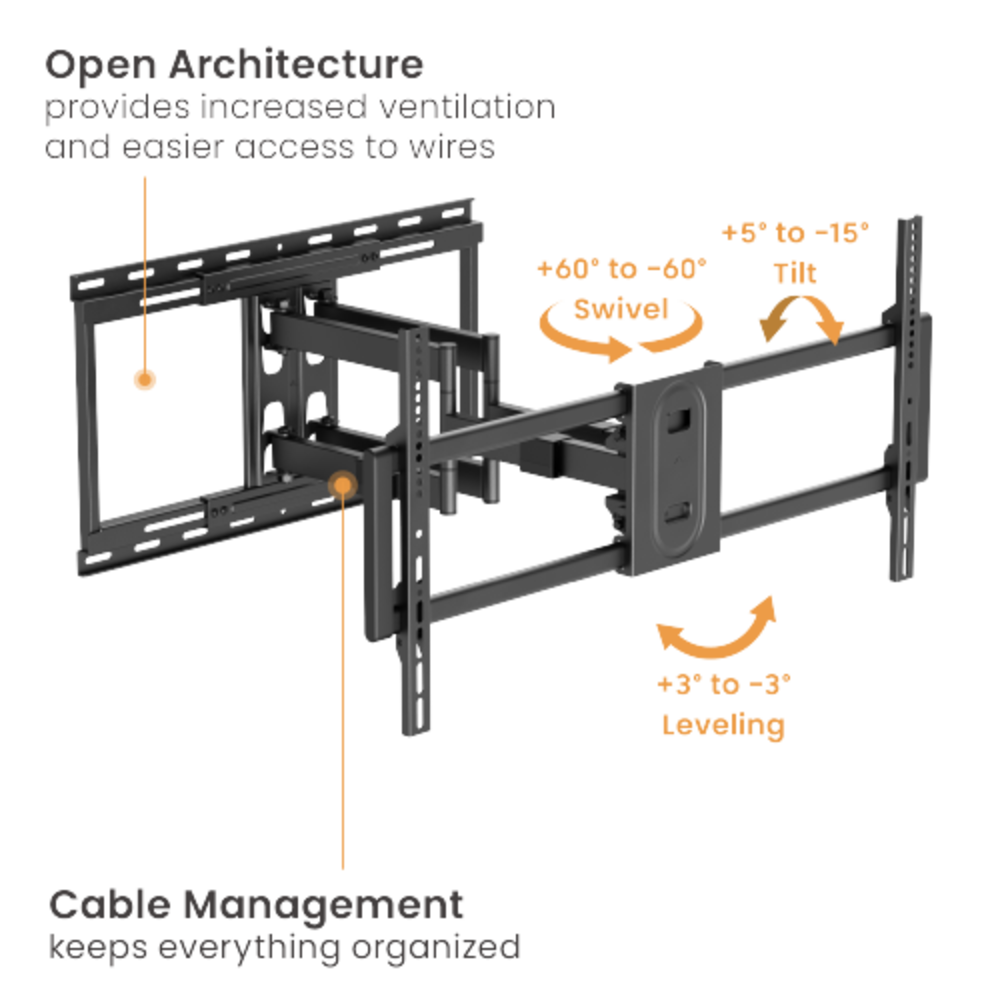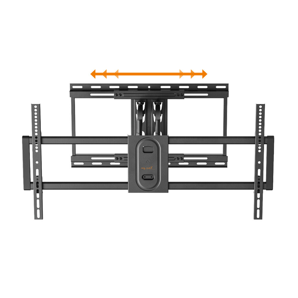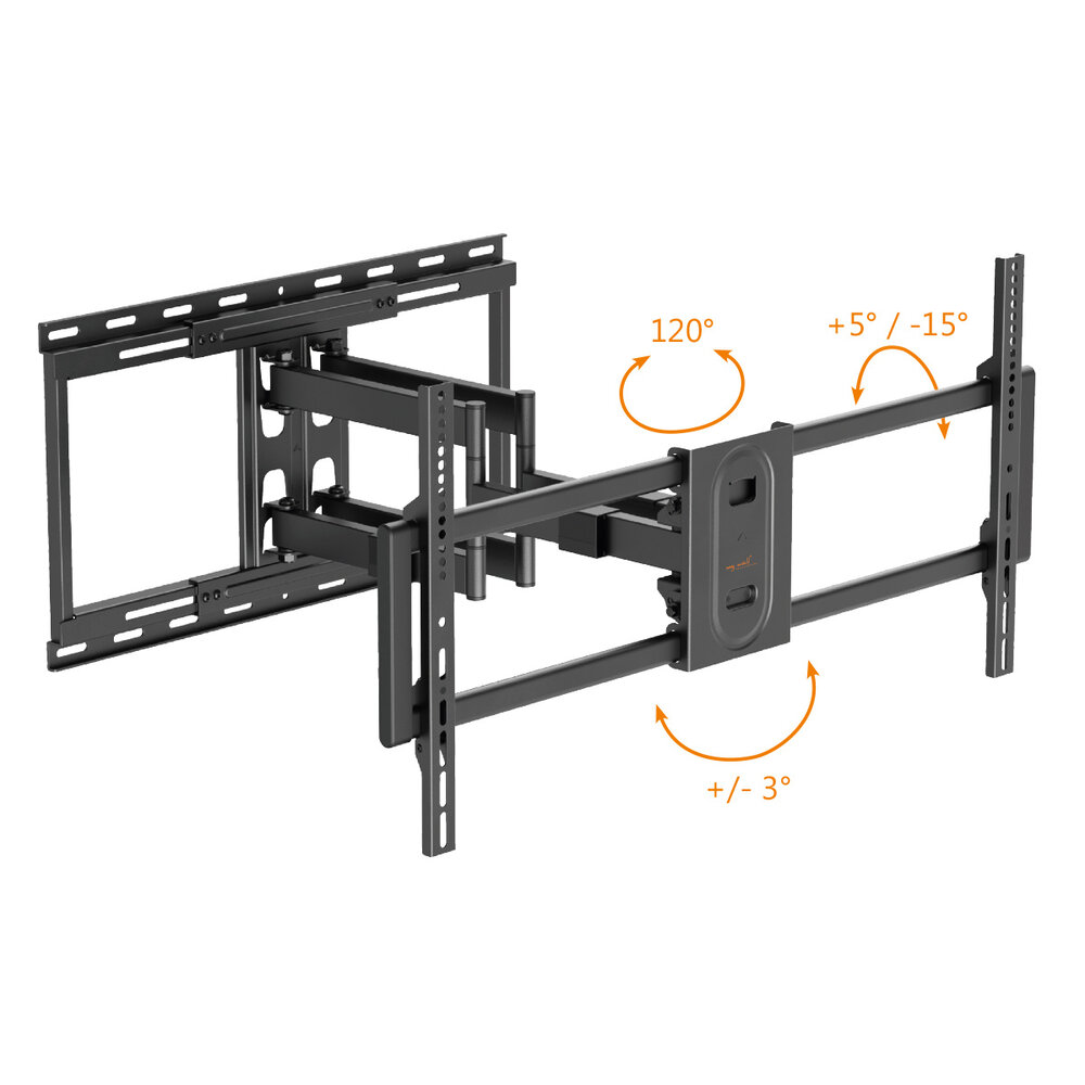 Een draaibare TV beugel die geschikt is voor de grotere schermen. Geschikt voor schermen van 43 t/m 100 inch met een gewicht tot maximaal 80 kg. Voorzien van een dubbele scharende arm, een dubbele arm zorgt voor meer stabiliteit, iets dat bij de grotere schermen wel welkom is. Je kunt het scherm na ophangen en uittrekken van de beugel tot maximaal 60° naar links of 60° naar rechts draaien, met een afstand van de wand ingeklapt 90 mm en uitgeklapt 635 mm kun je bij 100 inch schermen bijna de volledige 60° halen, er vanuit gaande dat er een wand achter zit, zit er geen wand dan kun je uiteraard zeker de volledige 60° halen.