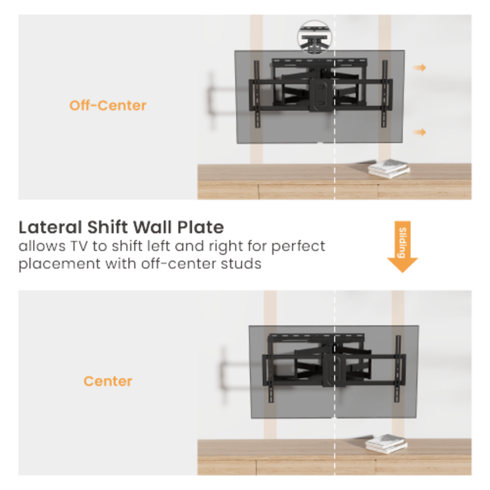 De bekabeling kan netjes door de kappen die je aan de beugel vind naar de wand worden gebracht. Je kunt bij deze beugel niet alleen de TV in het midden van de wandplaat monteren, maar eventueel ook aan de linker of rechterkant van de wandplaat, mocht dat beter uitkomen in uw situatie. De TV kan eenvoudig dankzij een klik borg systeem op de verticale armen worden losgekoppeld van de beugel en dat is bij het monteren dus ook zeer eenvoudig. Je monteert de gehele beugel, de verticale armen schroef je op de TV en als de gehele beugel is gemonteerd hang je het scherm pas aan de beugel.