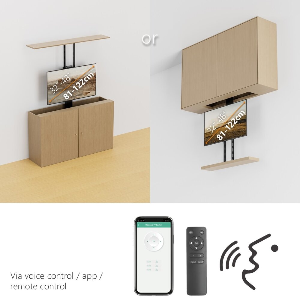Een TV lift waarbij de keuzevrijheid groot is. Je kunt ervoor kiezen om hem in een kast te bouwen en de kast op de vloer te zetten, waarbij de TV vanuit de kast omhoog komt. Je kunt er ook voor kiezen om een kast te maken en deze aan de wand of het plafond te hangen, waarbij de TV lift vanuit de kast omlaag komt.