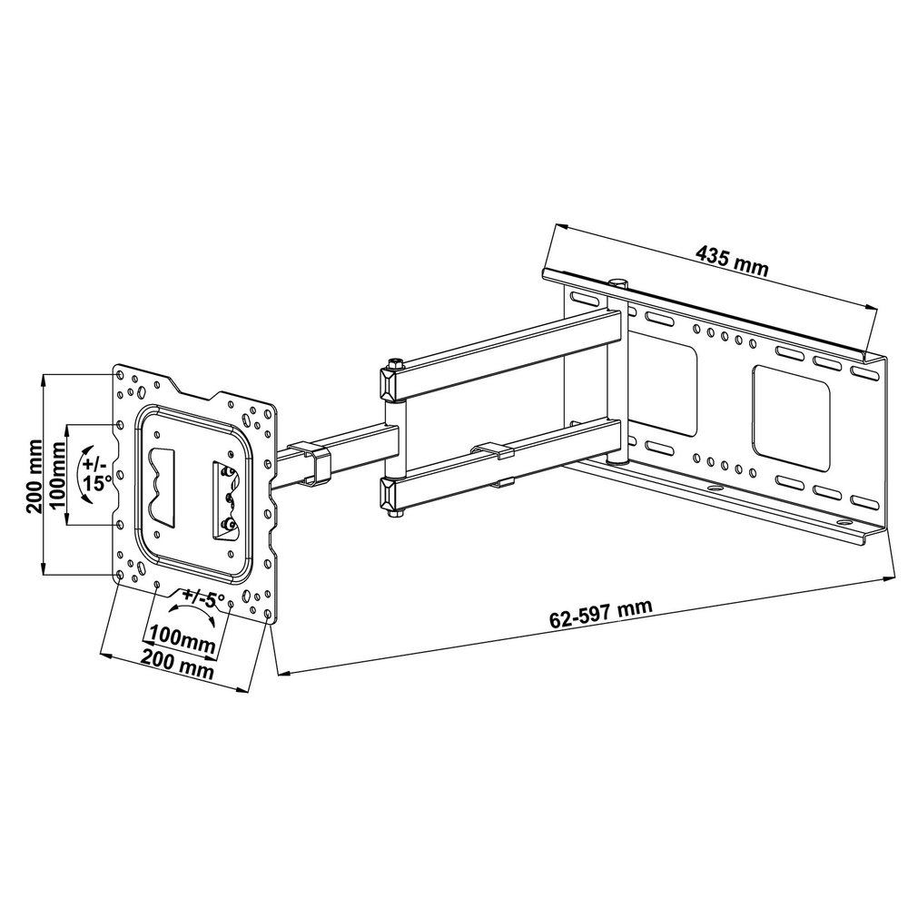 Een zeer functionele "Full Motion" beugel met een VESA gatenpatroon van minimaal 100 x 100 tot maximaal 200 x 200 mm. Dankzij een eenvoudige constructie is dit een zeer sterke beugel die geschikt is voor schermen tot maximaal 40 kg. De afstand tot de wand in volledig ingeklapte stand is 62mm en volledig uitgeklapt komt de TV maar liefst 595 mm van de wand, wat dus inhoud dat je de TV vrijwel volledig zou kunnen draaien. Een ideale TV beugel als het gaat om de functionaliteit gecombineerd met een zeer scherpe prijs.